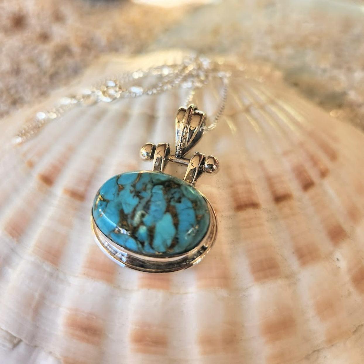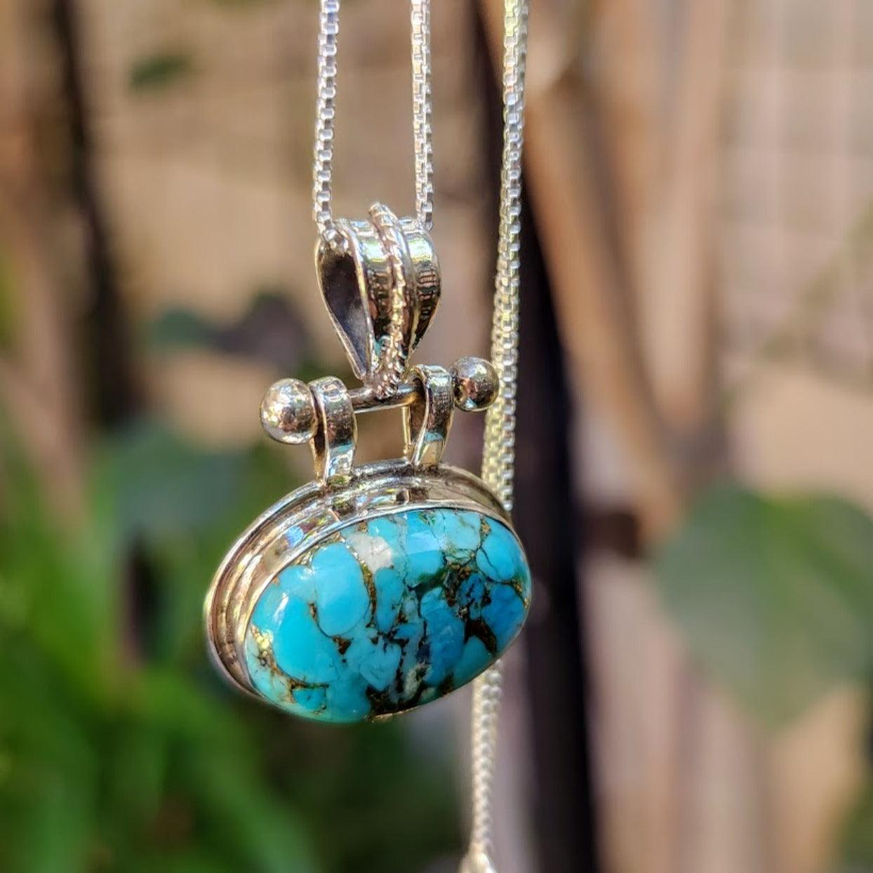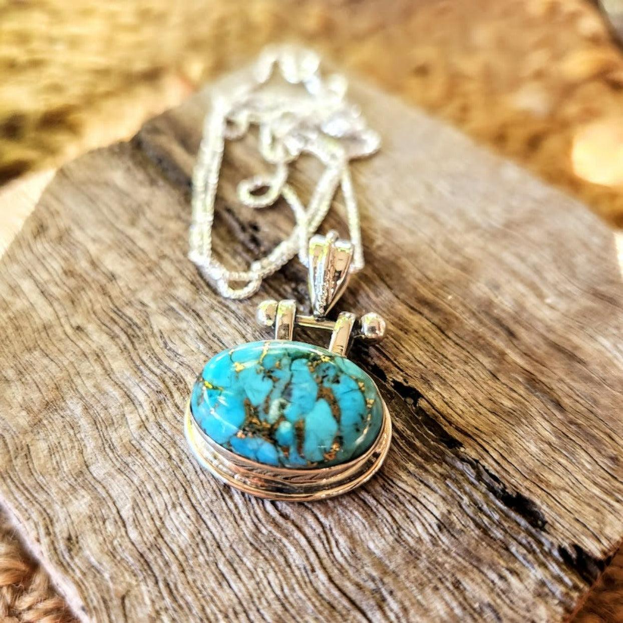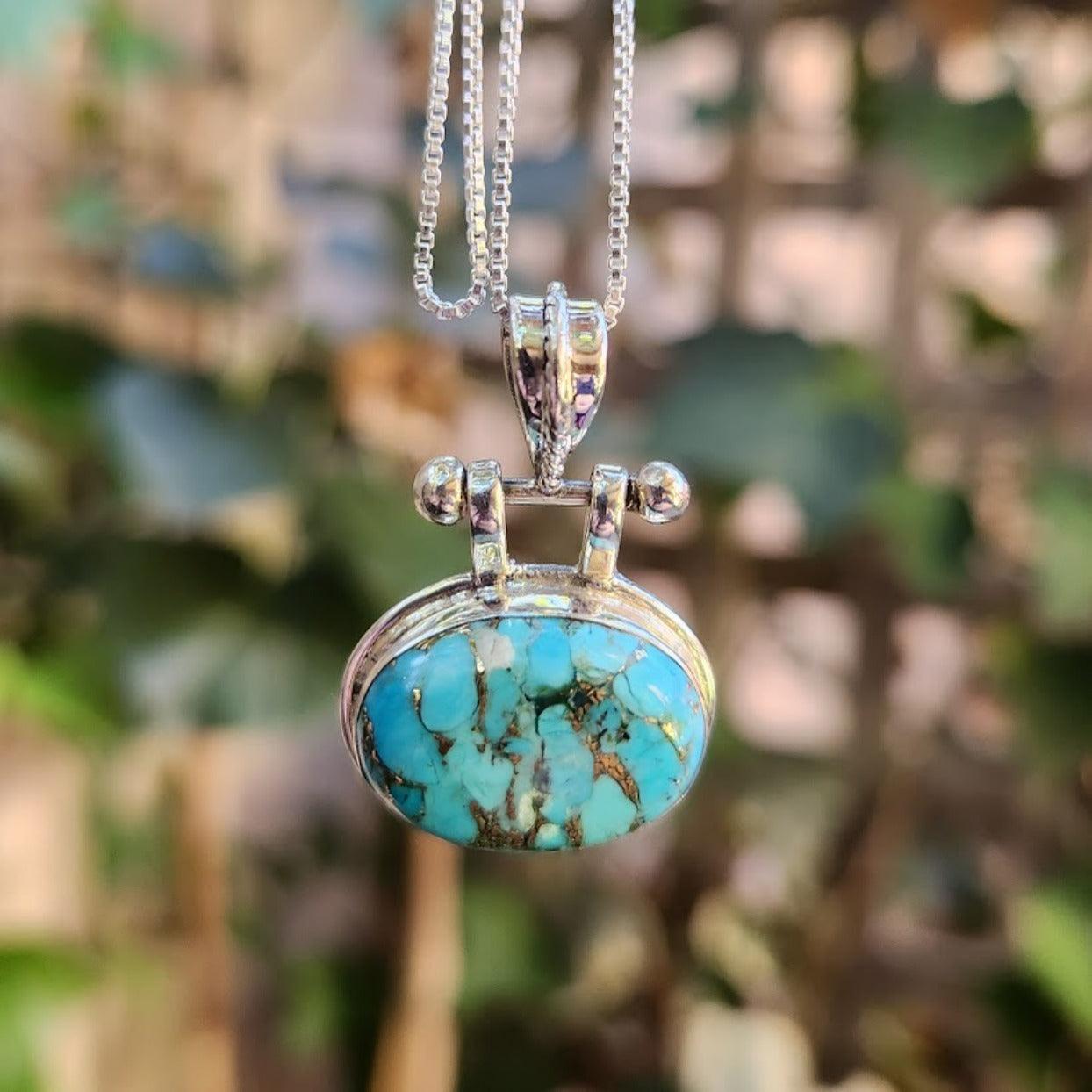 Handmade Copper Turquoise Oval Pendant with 925 Sterling Silver Bar / 925 Sterling Silver 18 inch Chain included / Silver Polishing Cloth included in every purchase