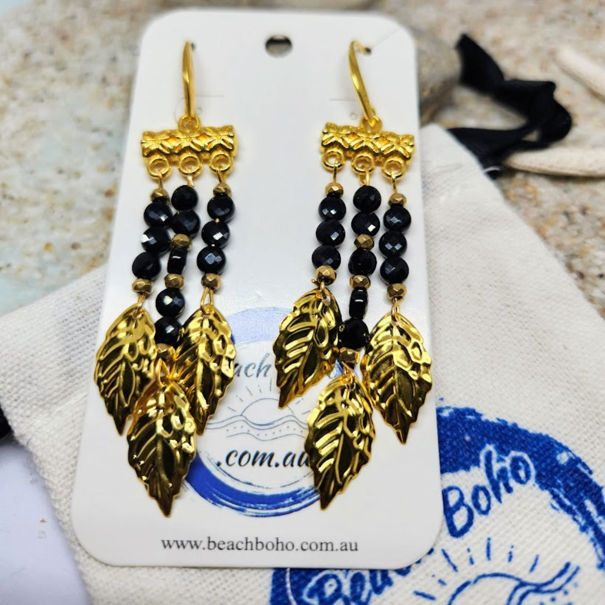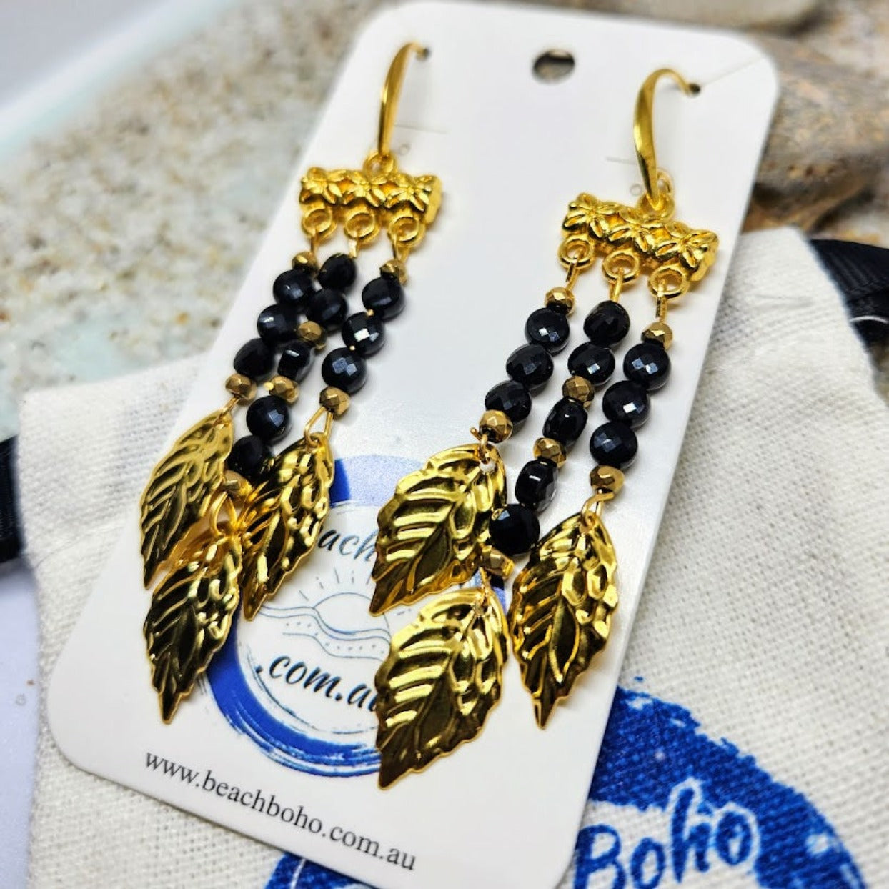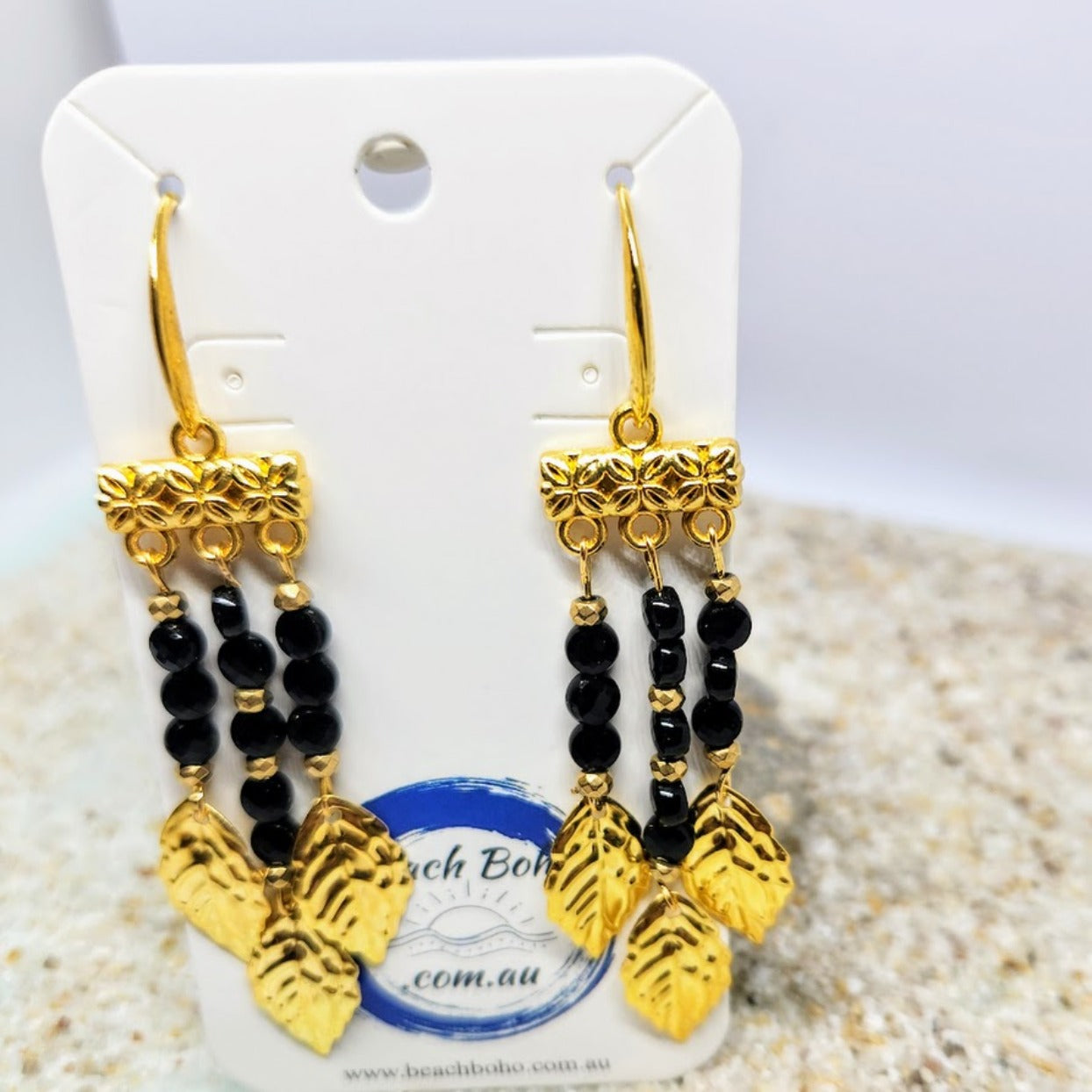 GOLDEN LEAVES - ONYX DANGLE HOOK EARRINGS