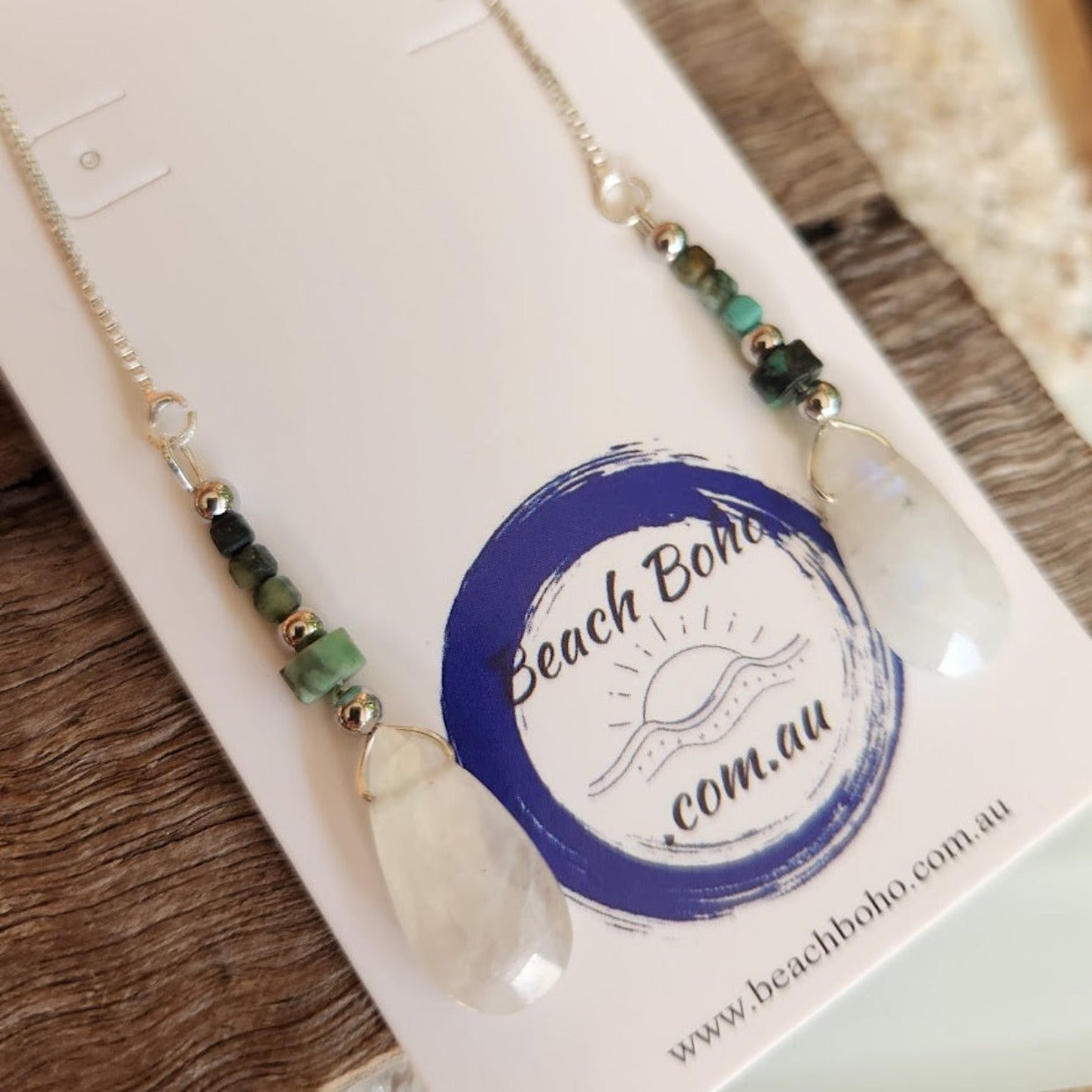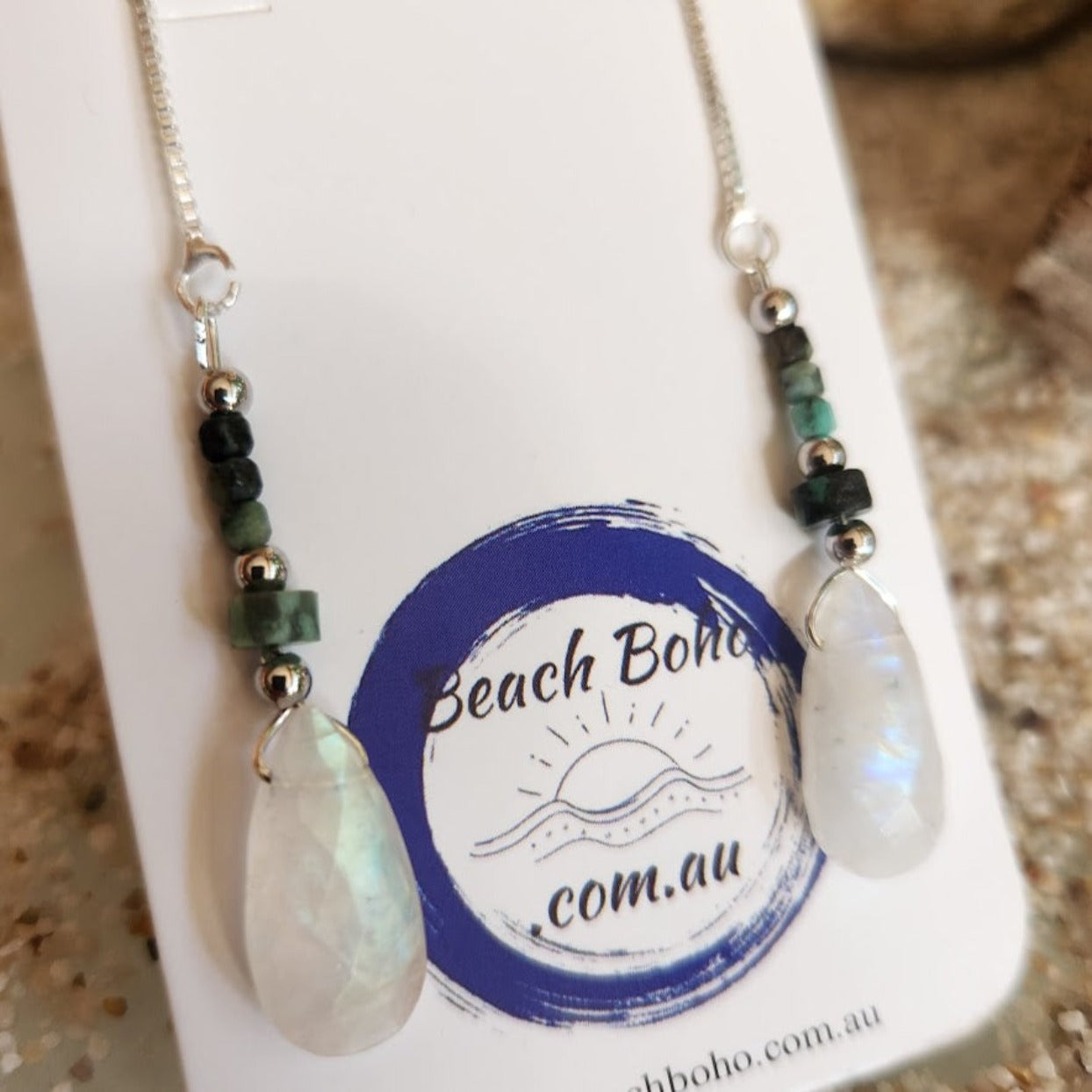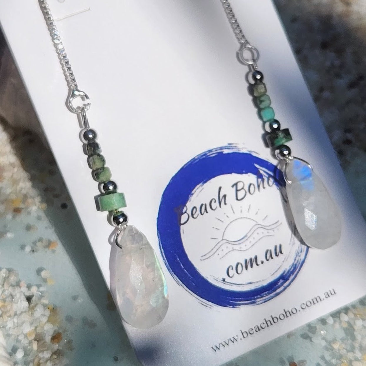 GREEN MOON - 925 STERLING SILVER THREAD TURQUOISE & MOONSTONE EARRINGS