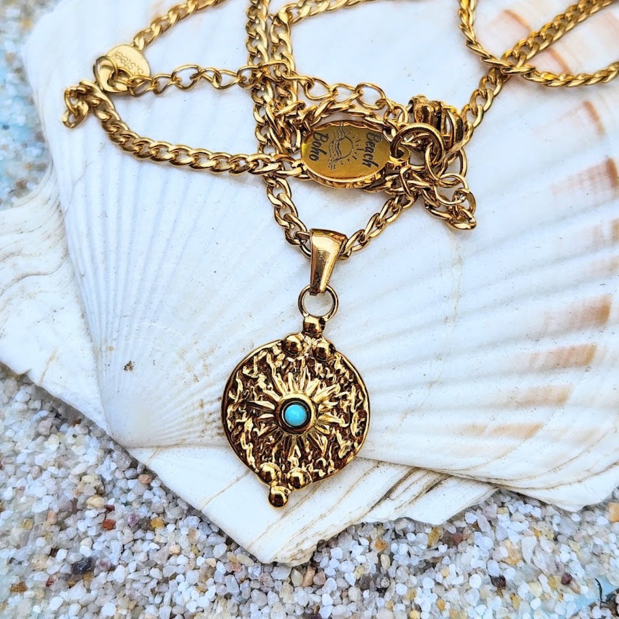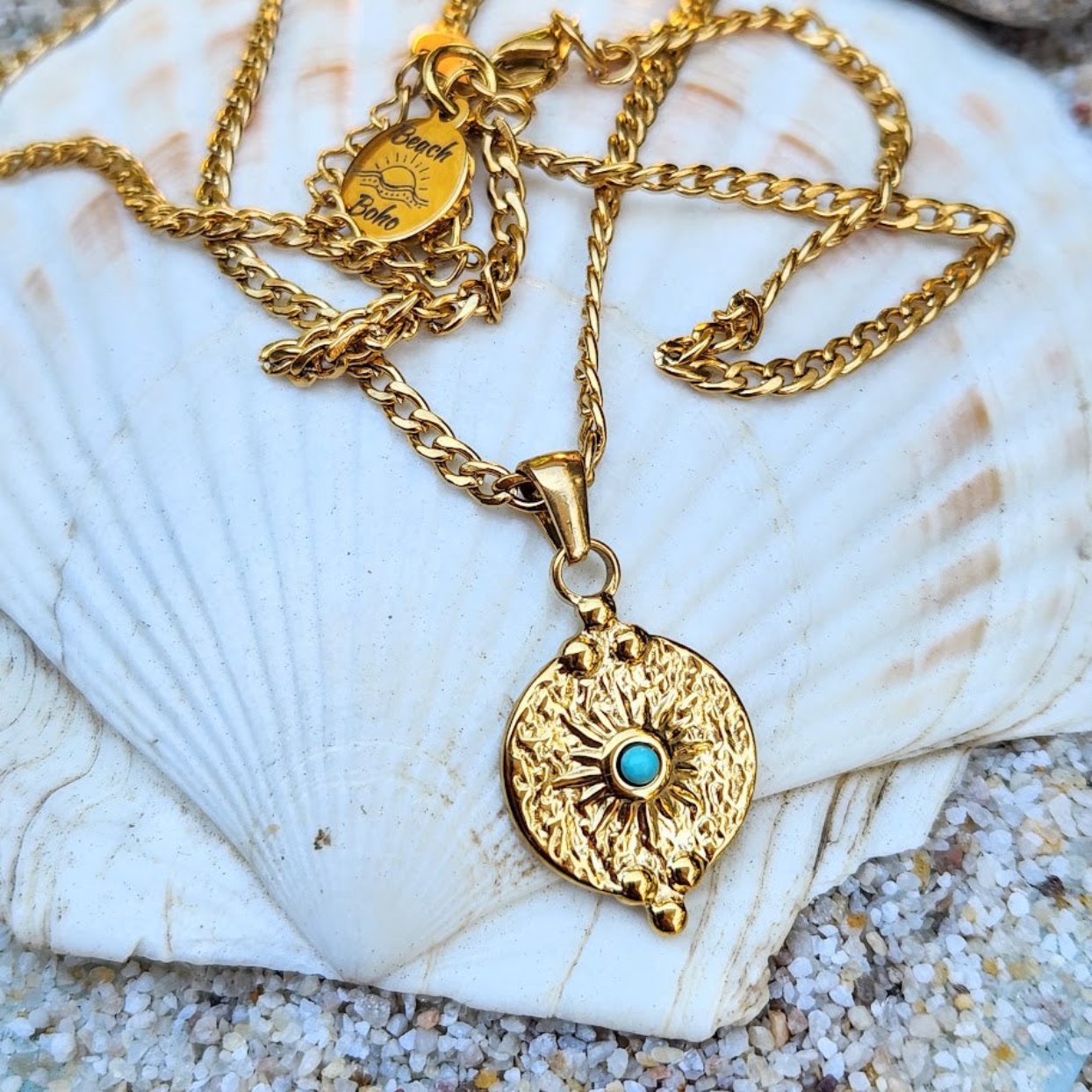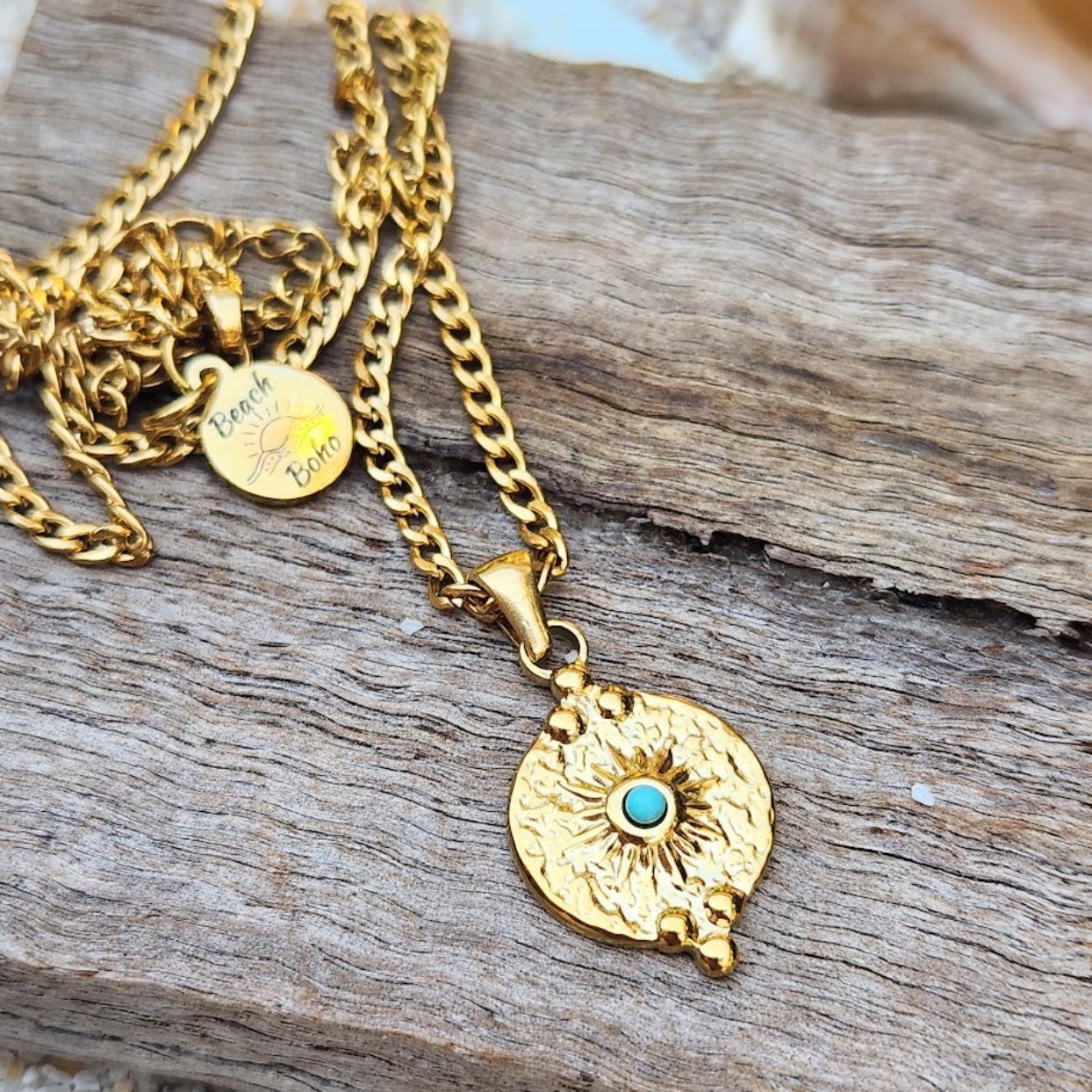 Gold Hammered Style Detailed Pendant with Turquoise Blue stone 18k Gold Waterproof & Tarnish Resistant Necklace