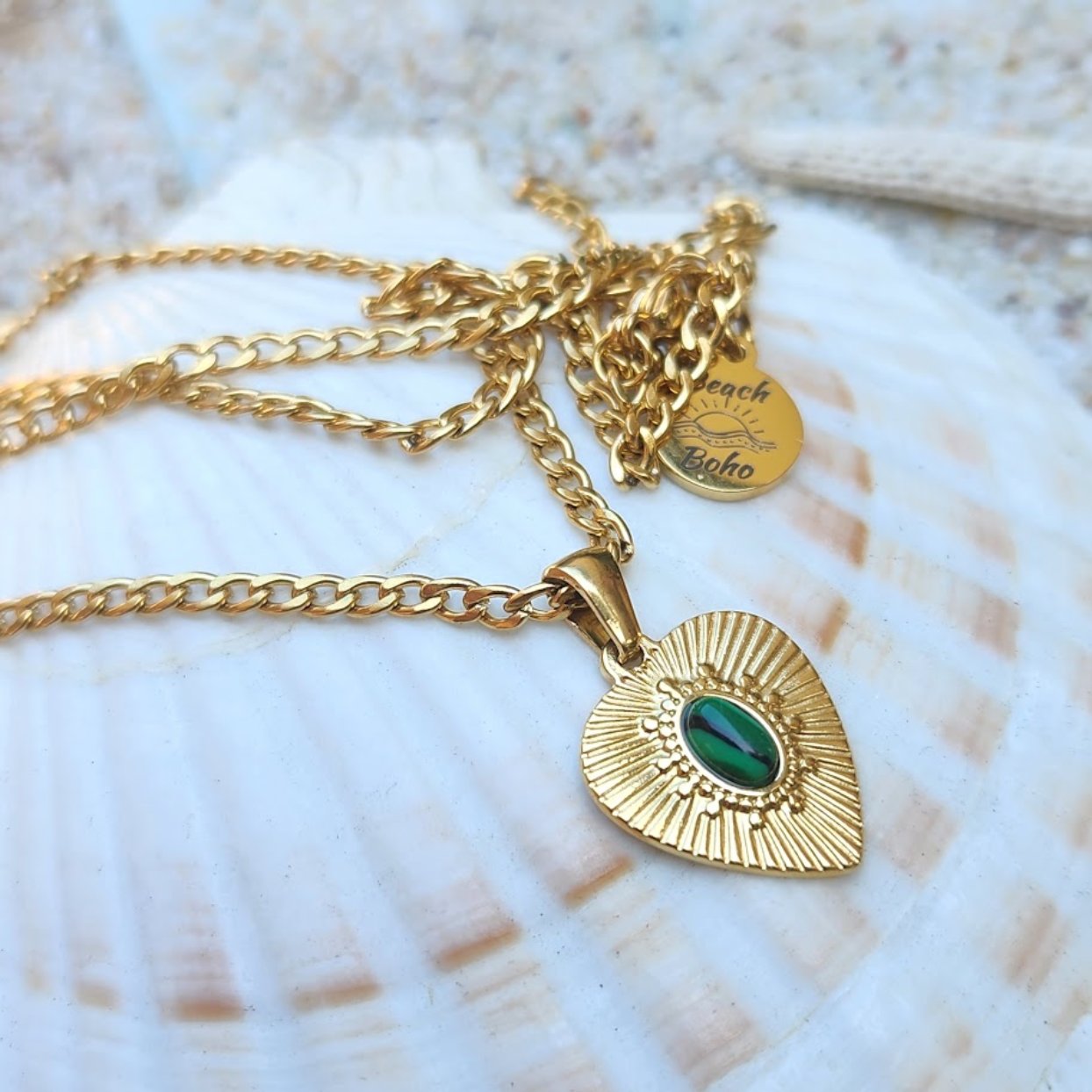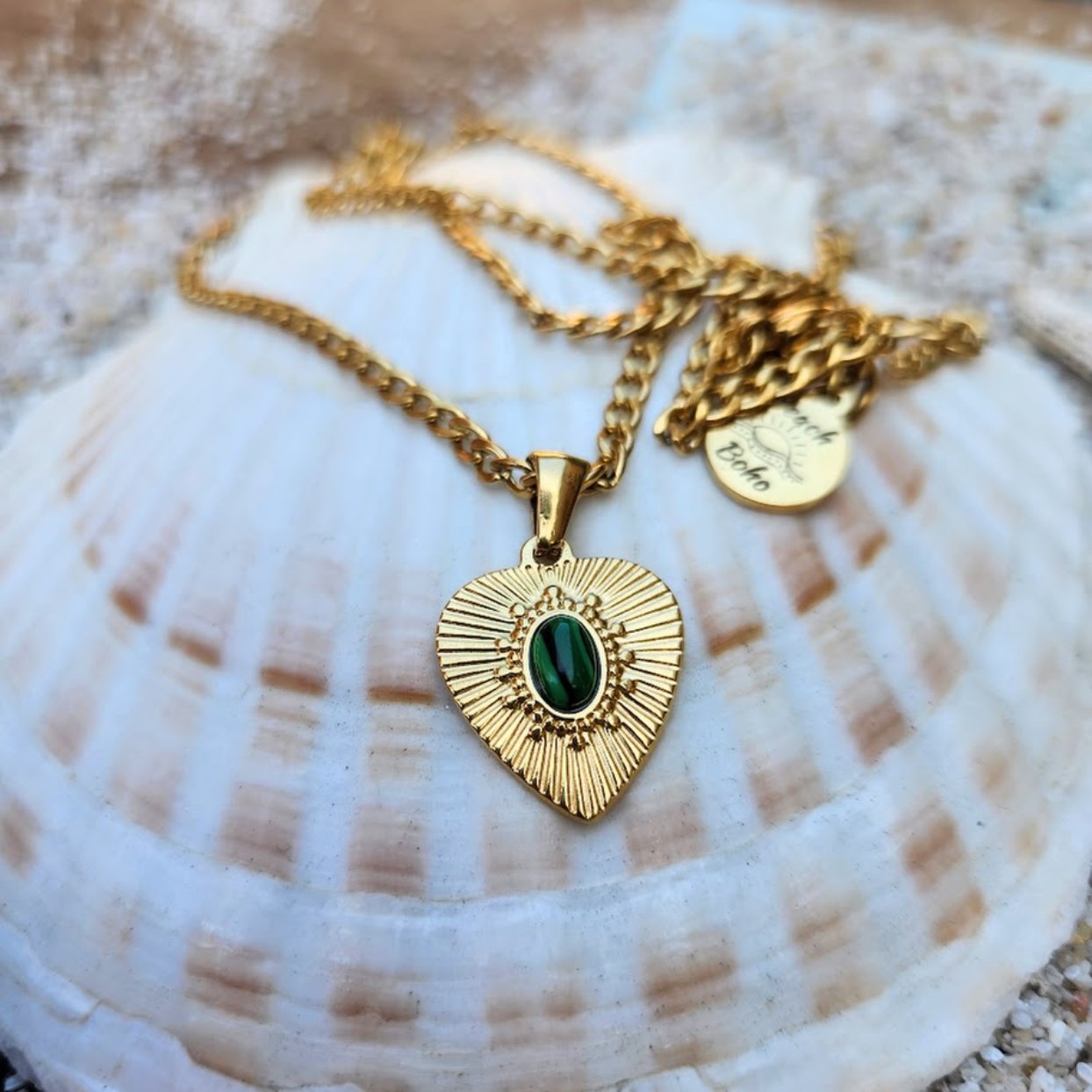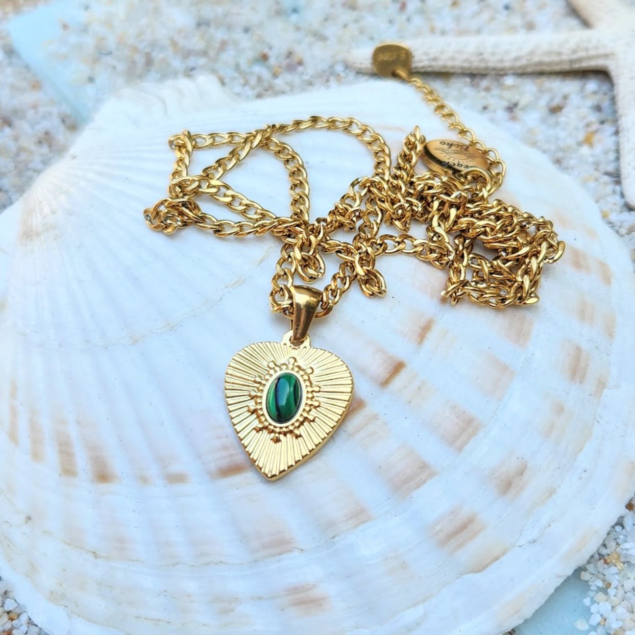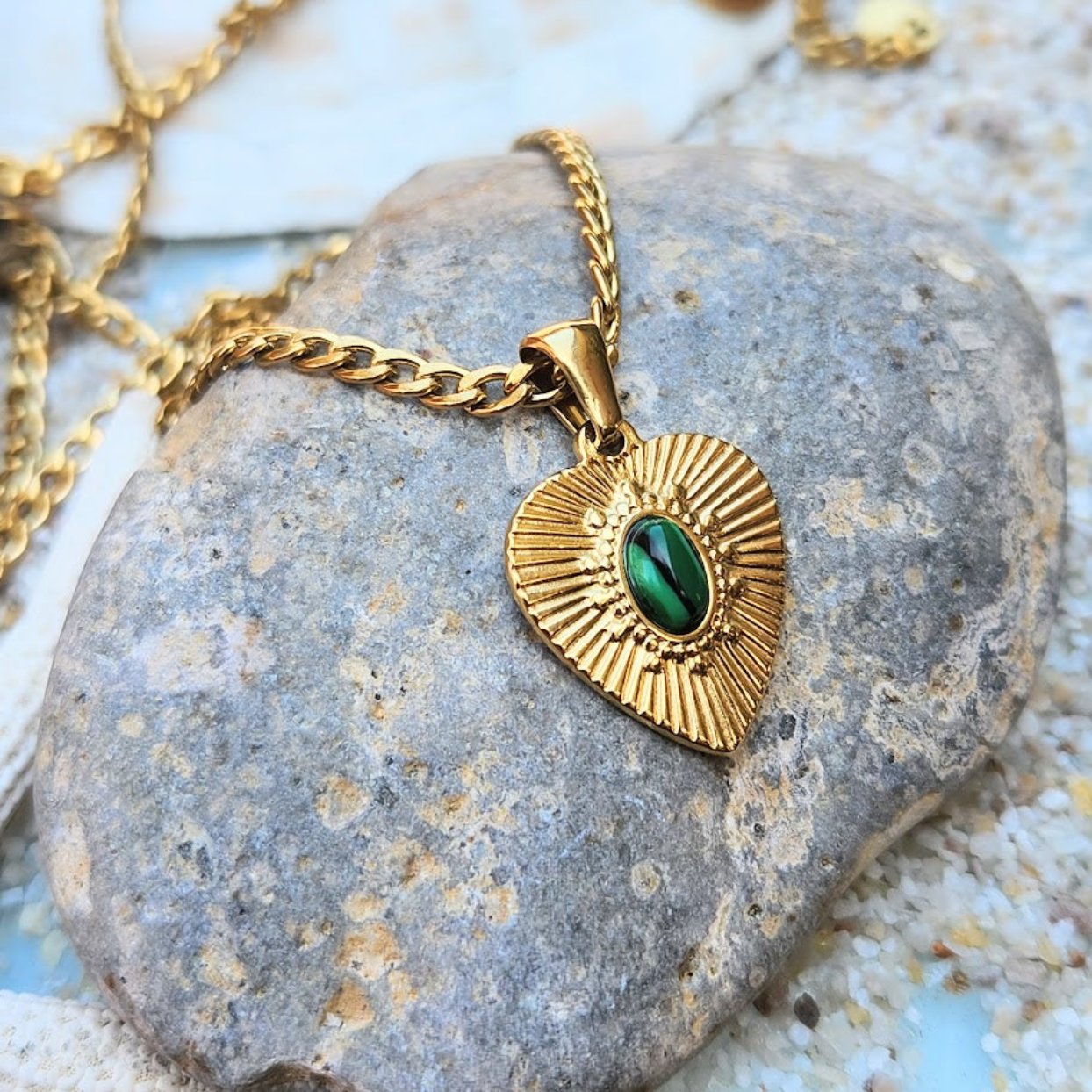 PURE OF HEART - WATERPROOF 18K GOLD MALACHITE STONE PENDANT NECKLACE