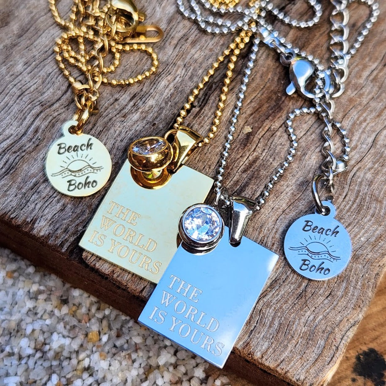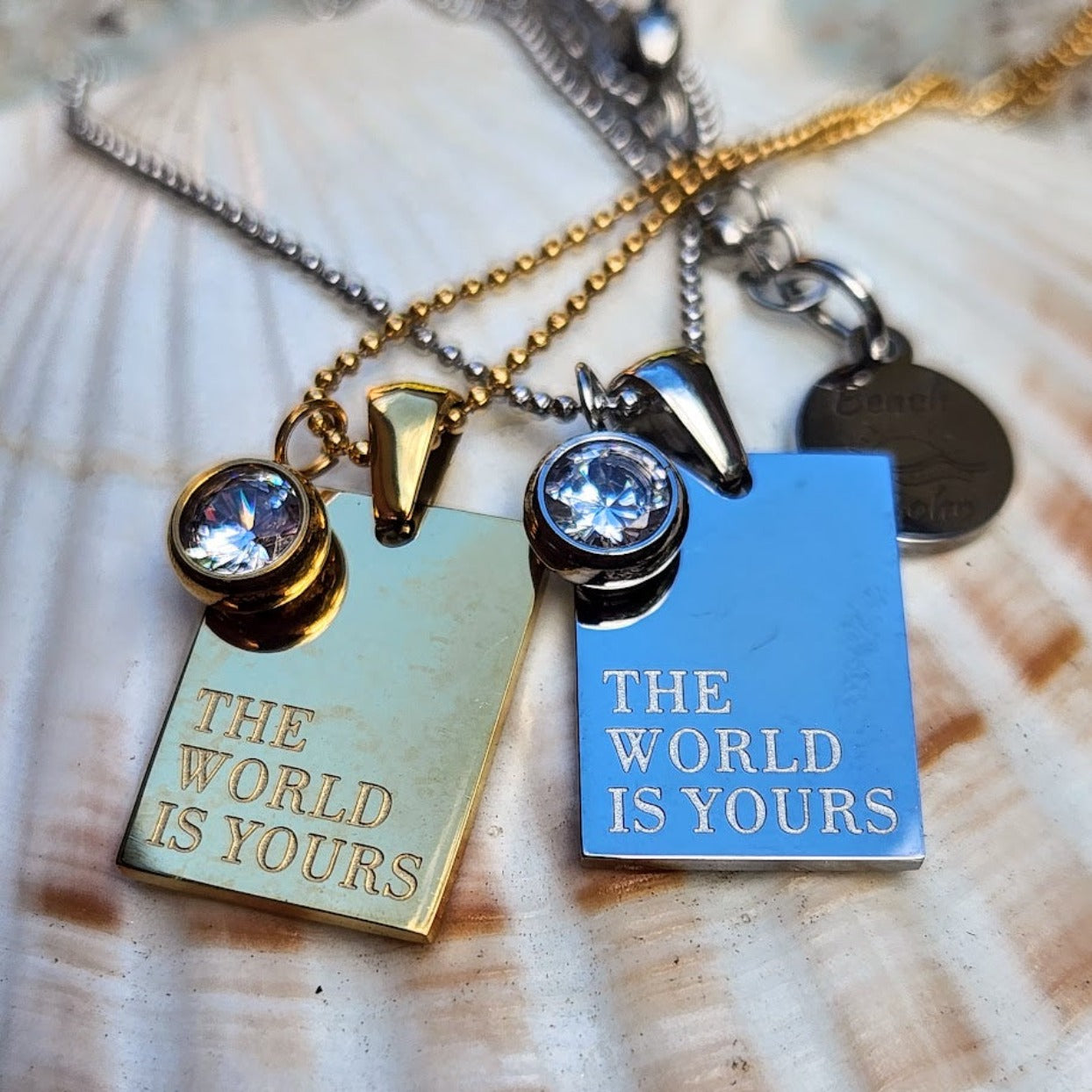 ENGRAVED NECKLACE - CZ WATERPROOF 'BREATHE' & 'THE WORLD IS YOURS' IN SILVER OR 18K GOLD