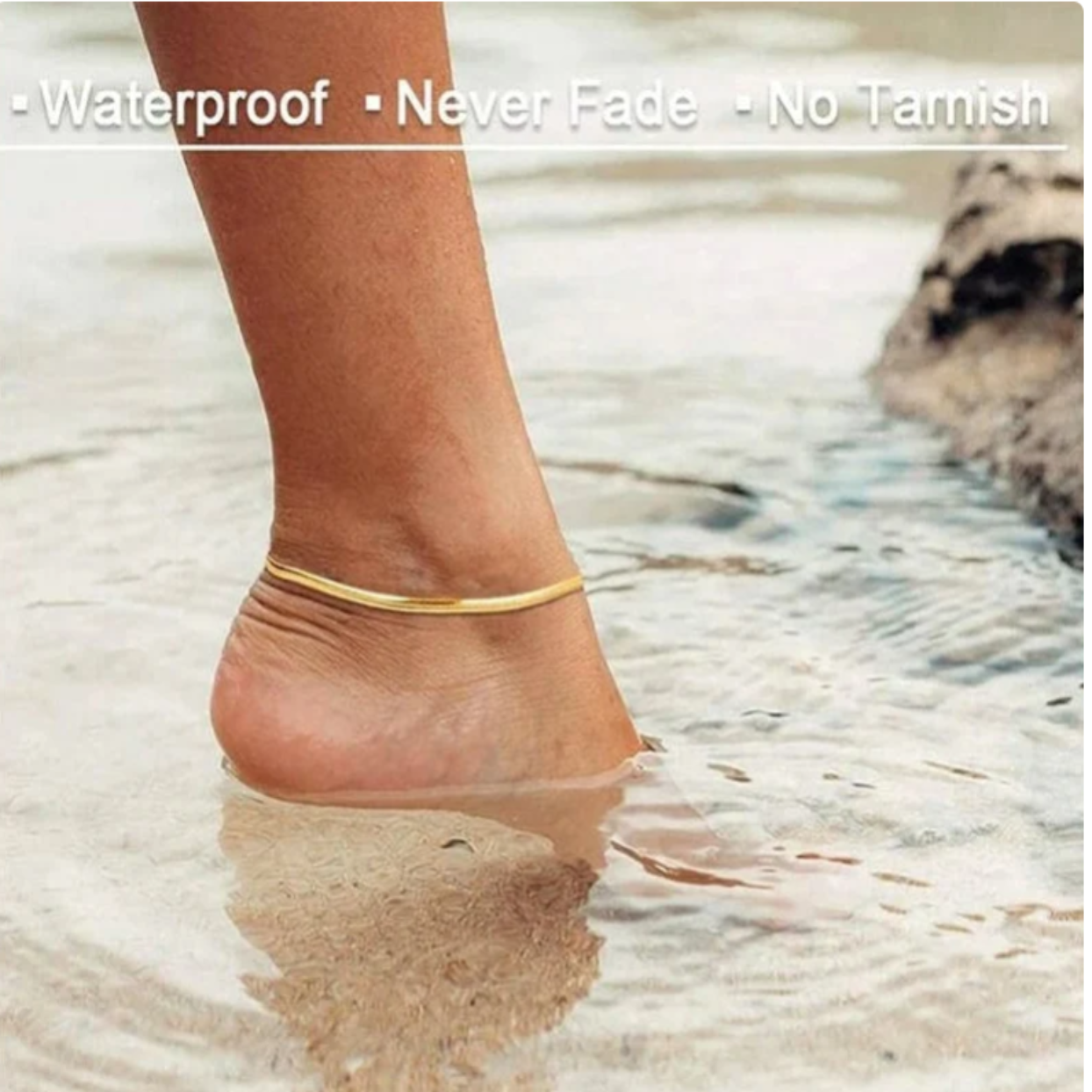 Classic Snake 18k Gold Plated Chain Anklet Silver (Stainless Steel)  / Waterproof / Sweat Proof / Hyper Allergenic / Use at Gym, swimming... yours to enjoy