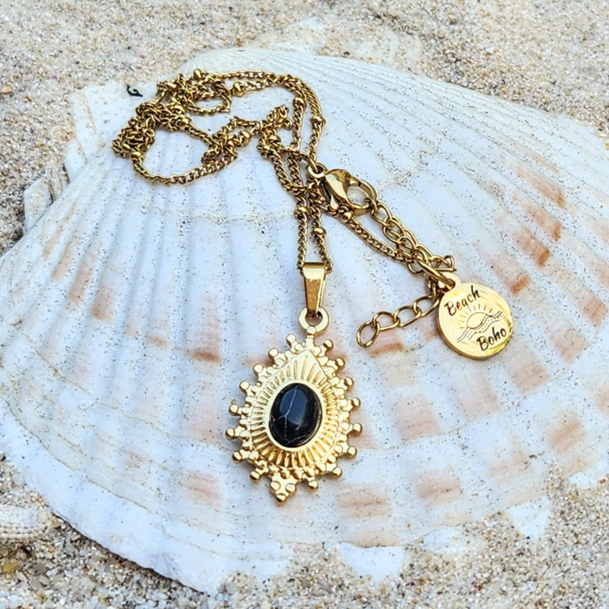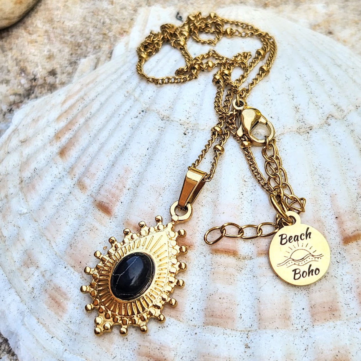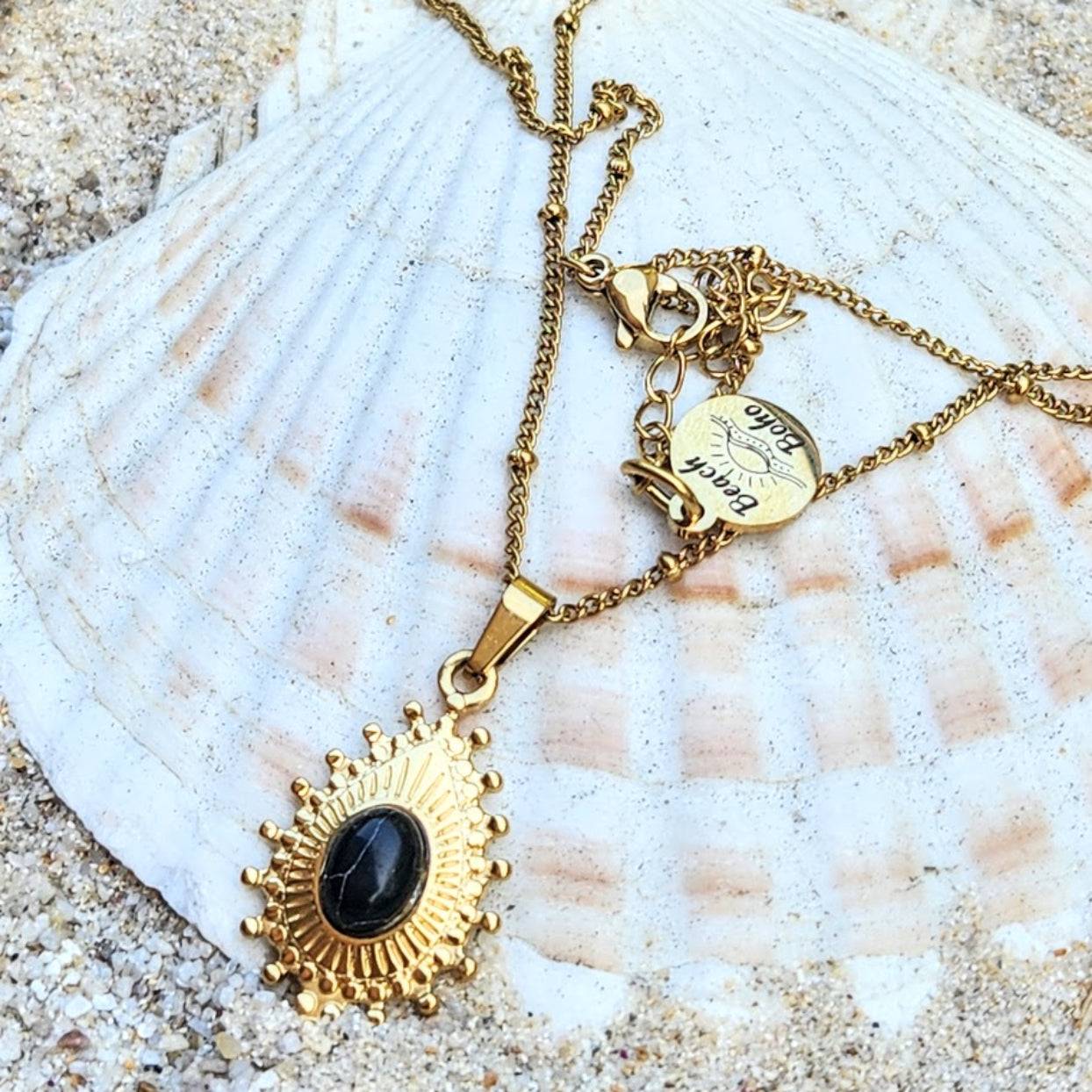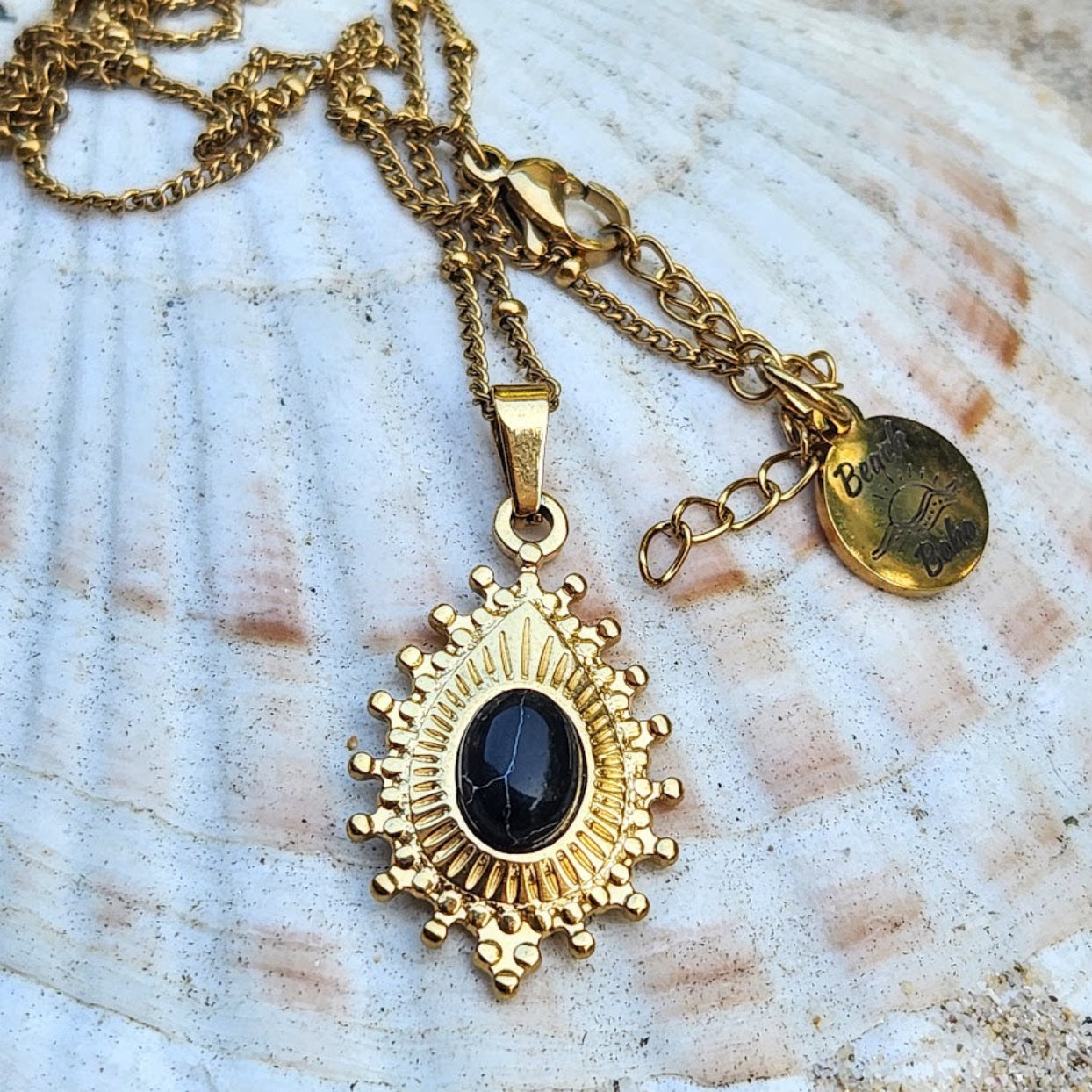 BLACK STONE - WATERPROOF 18K GOLD TOURMALINE STONE PENDANT NECKLACE