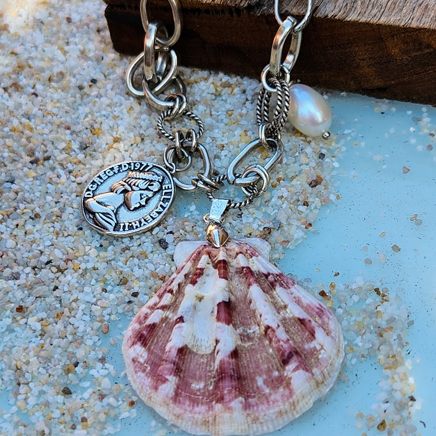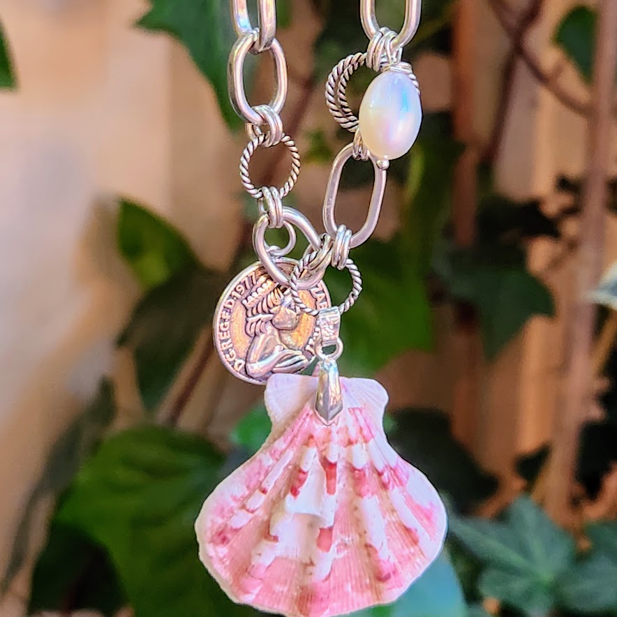 Natural Pink and White Shell 925 Sterling Silver Multi Chain Necklace with Coin and Baroque Pearls Charms Beautiful Boho Piece for Summer and festivals