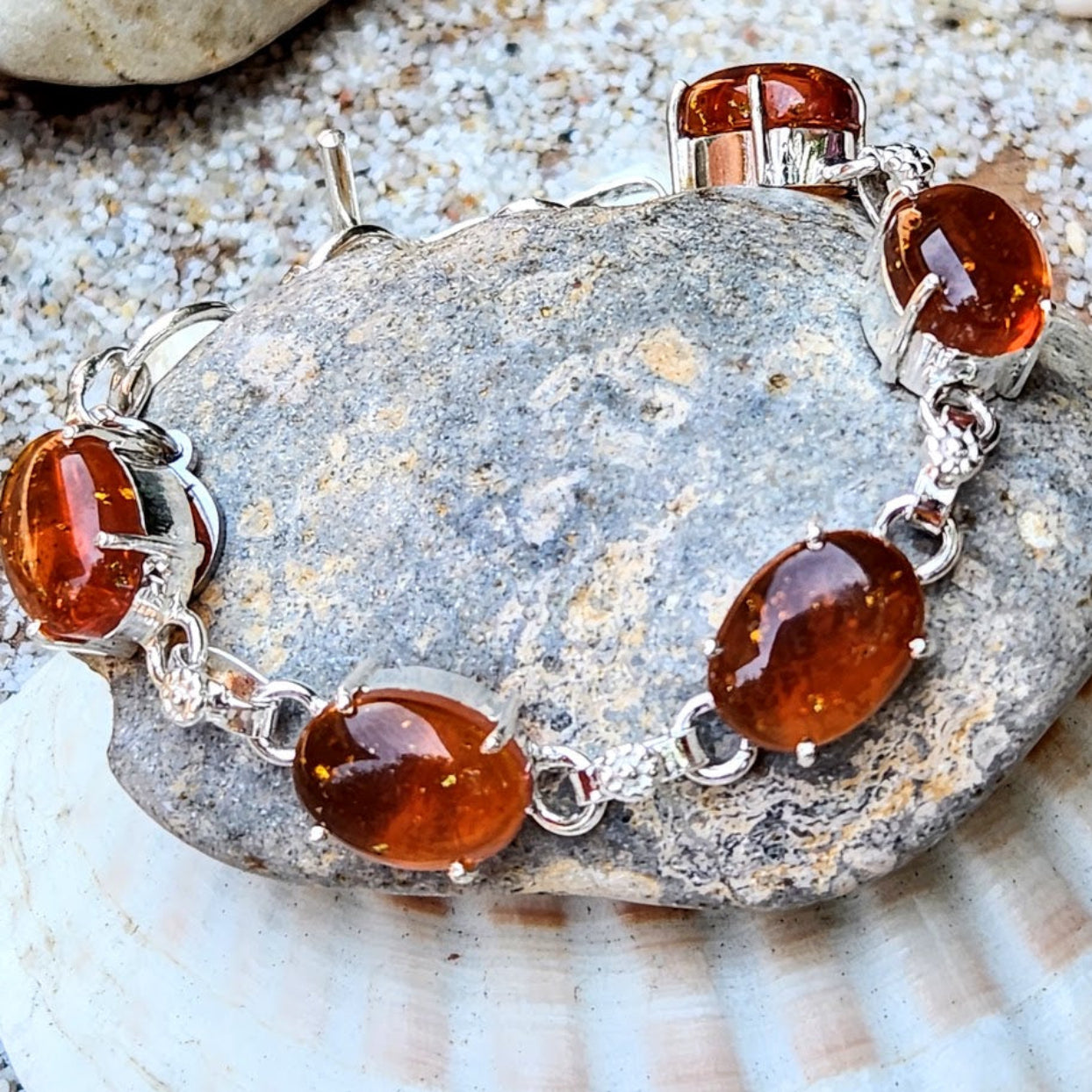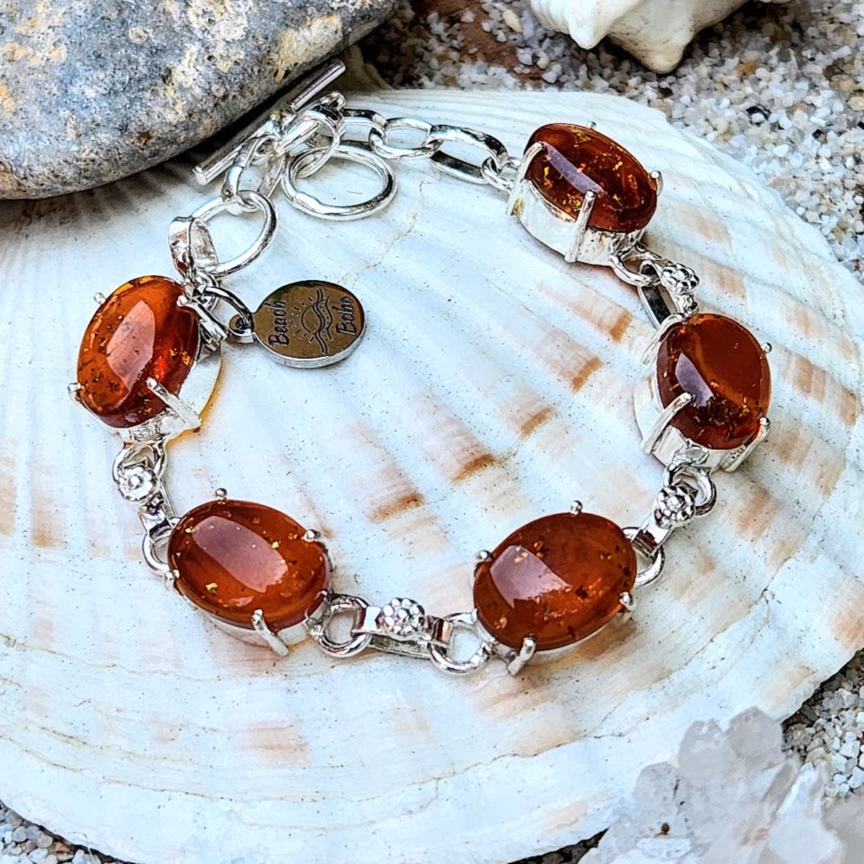 Sterling Silver Handmade Bracelet - Amber Charms & Polished Silver