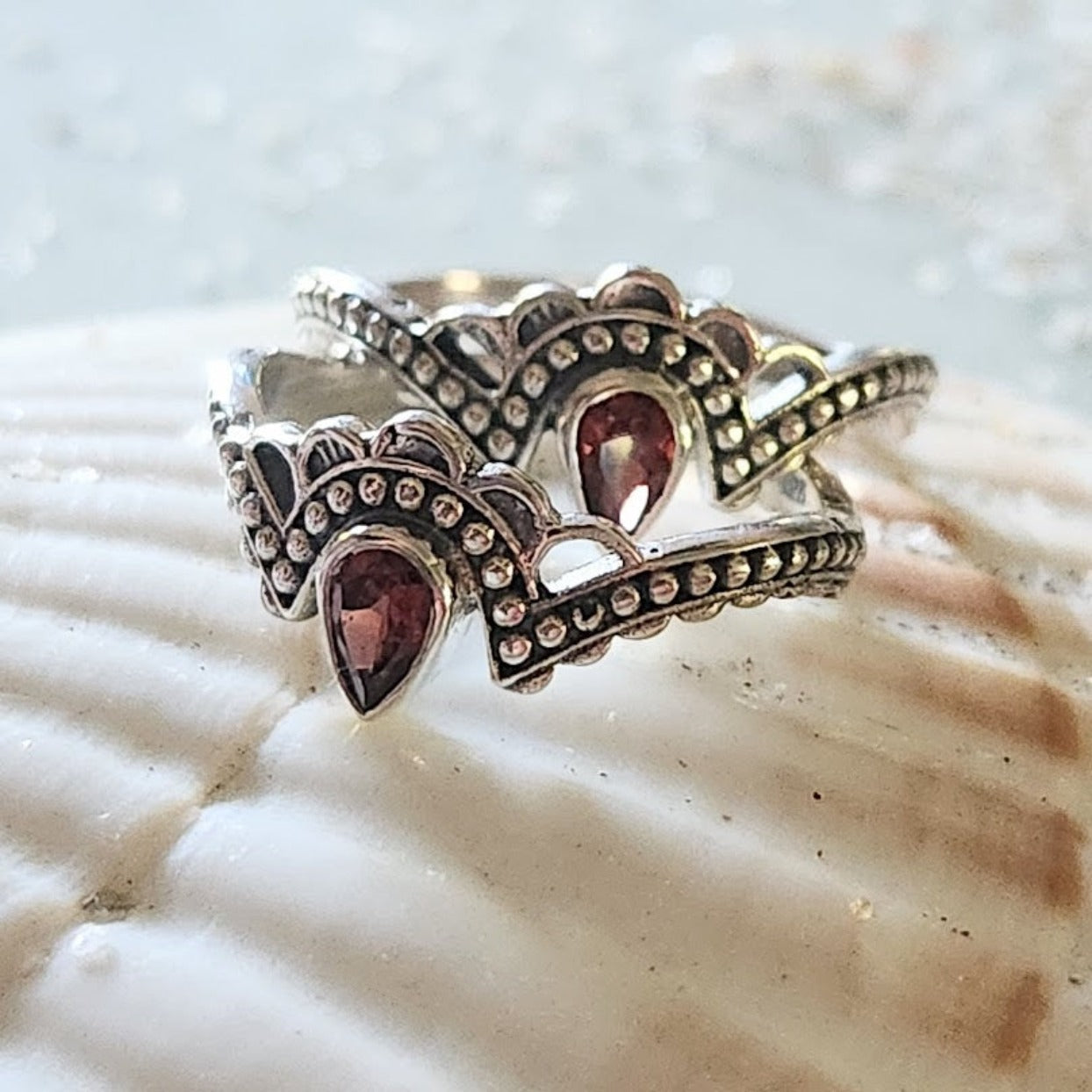 Bohemian Retro Style 925 Sterling Silver Garnet Teardrop Shaped Gemstone Ring
