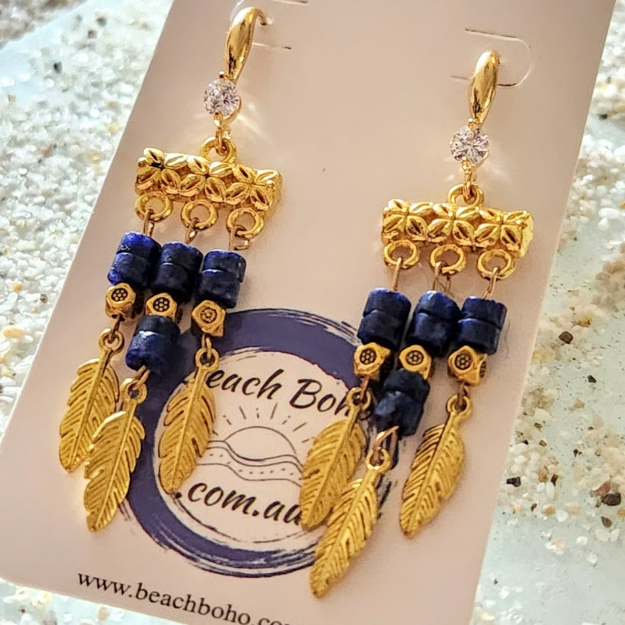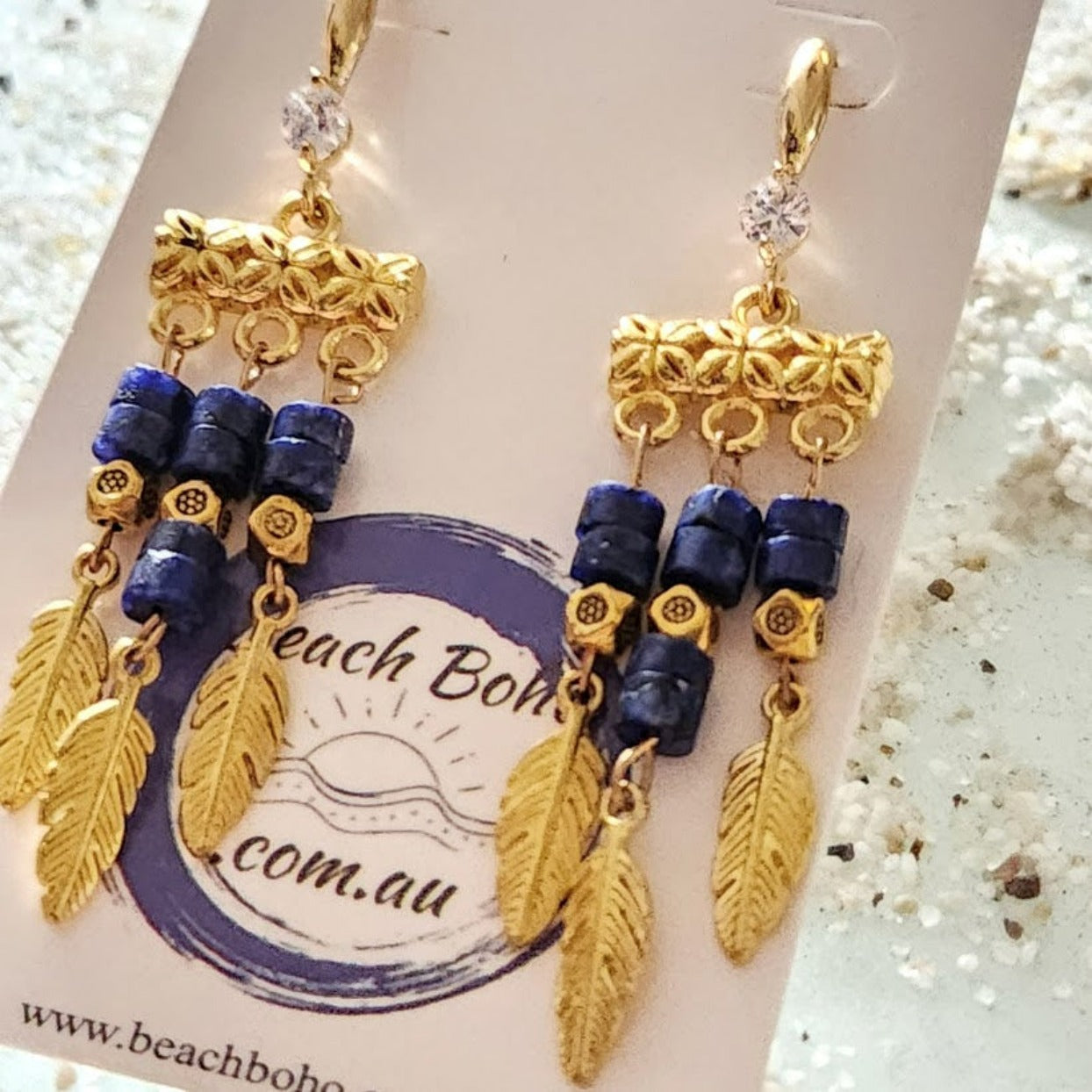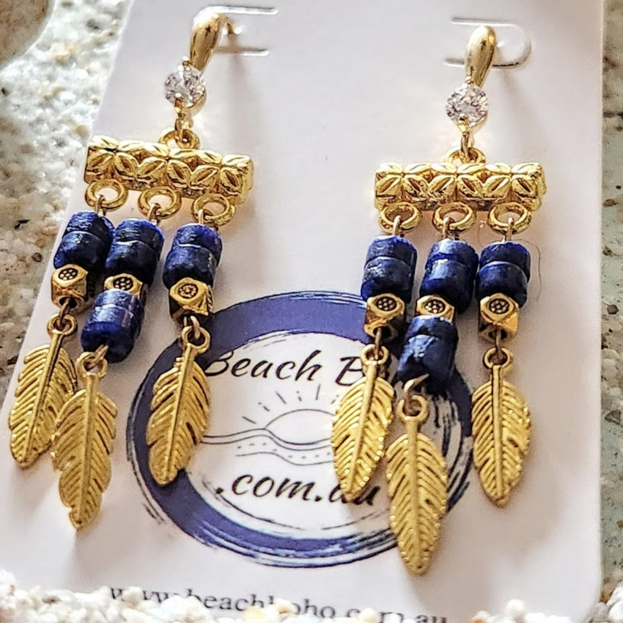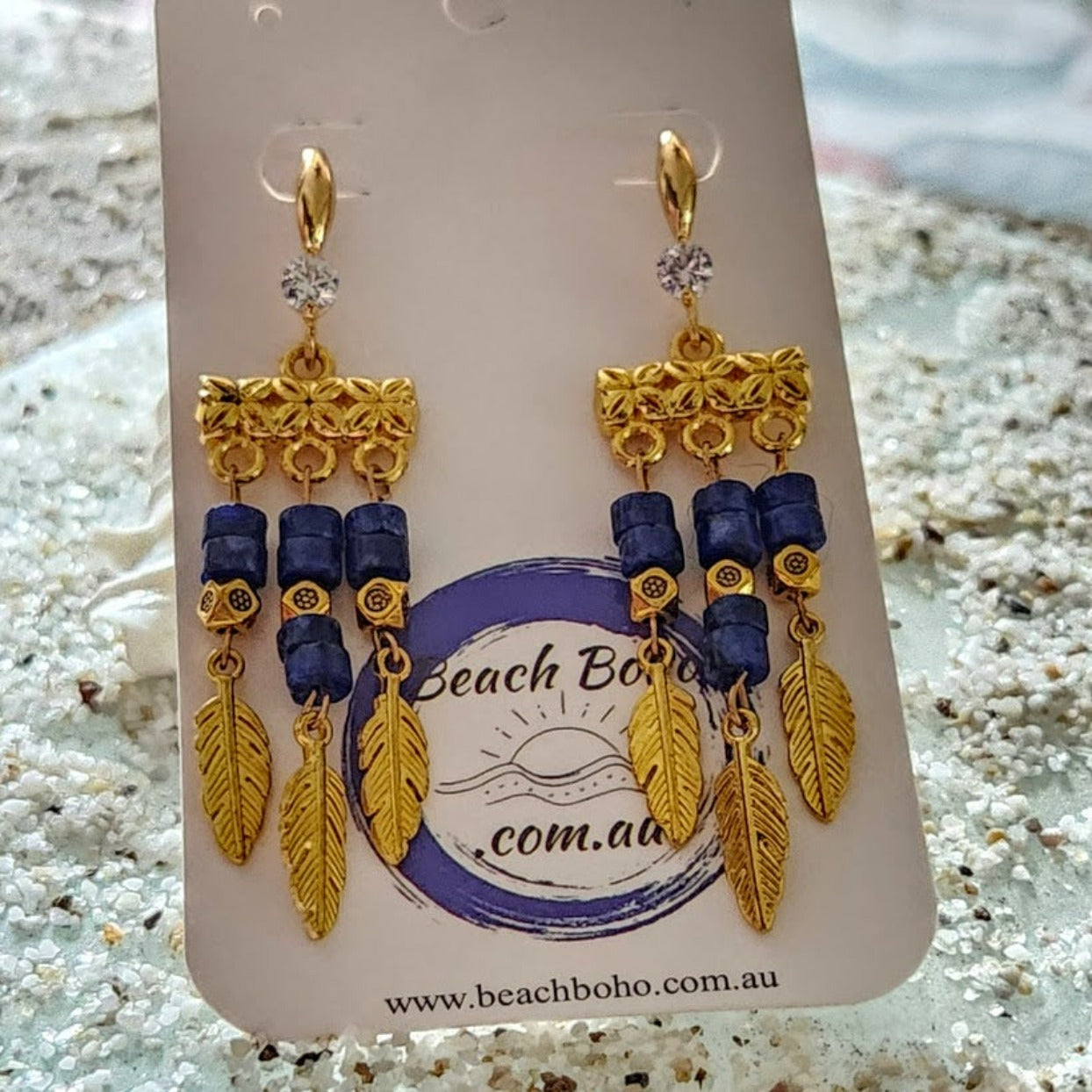 ROYAL BLUE LEAVES - GOLD HOOK LEAF EARRINGS