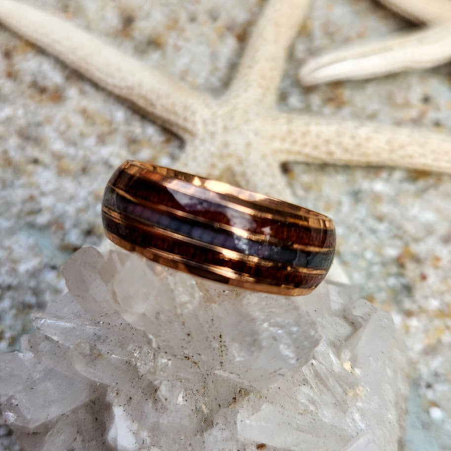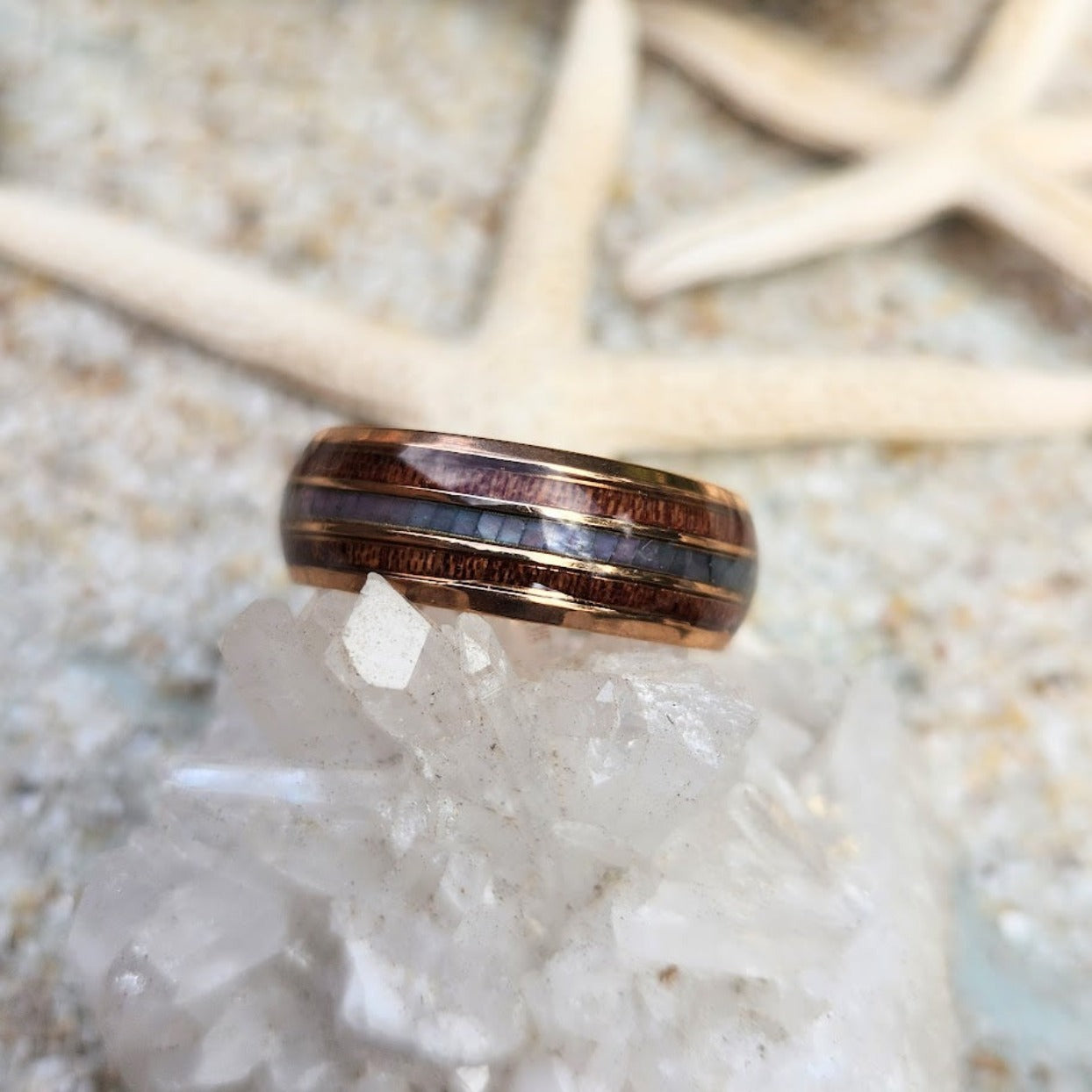 Rose Gold Paua Shell (Abalone) & Wood Inlay Waterproof Men's Ring