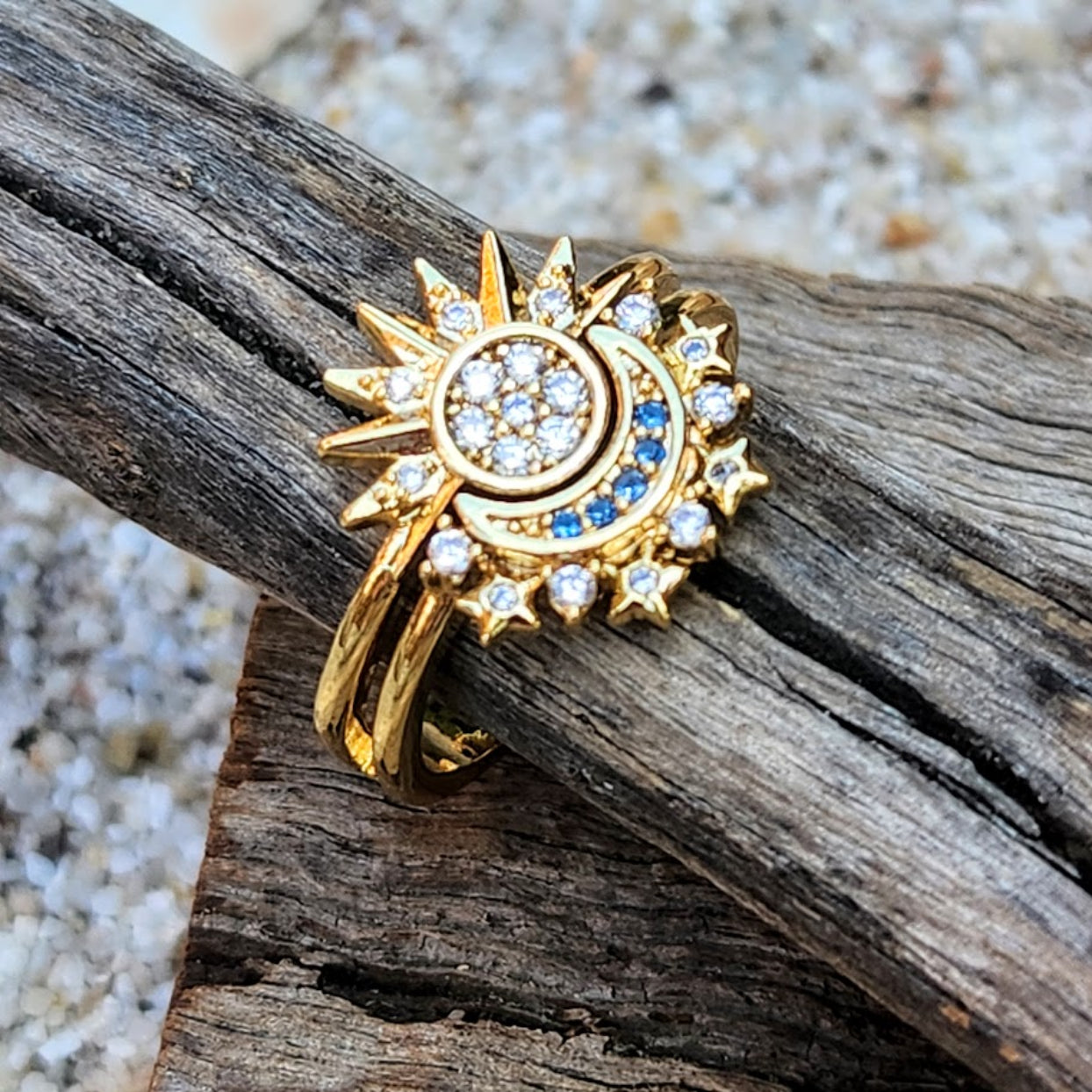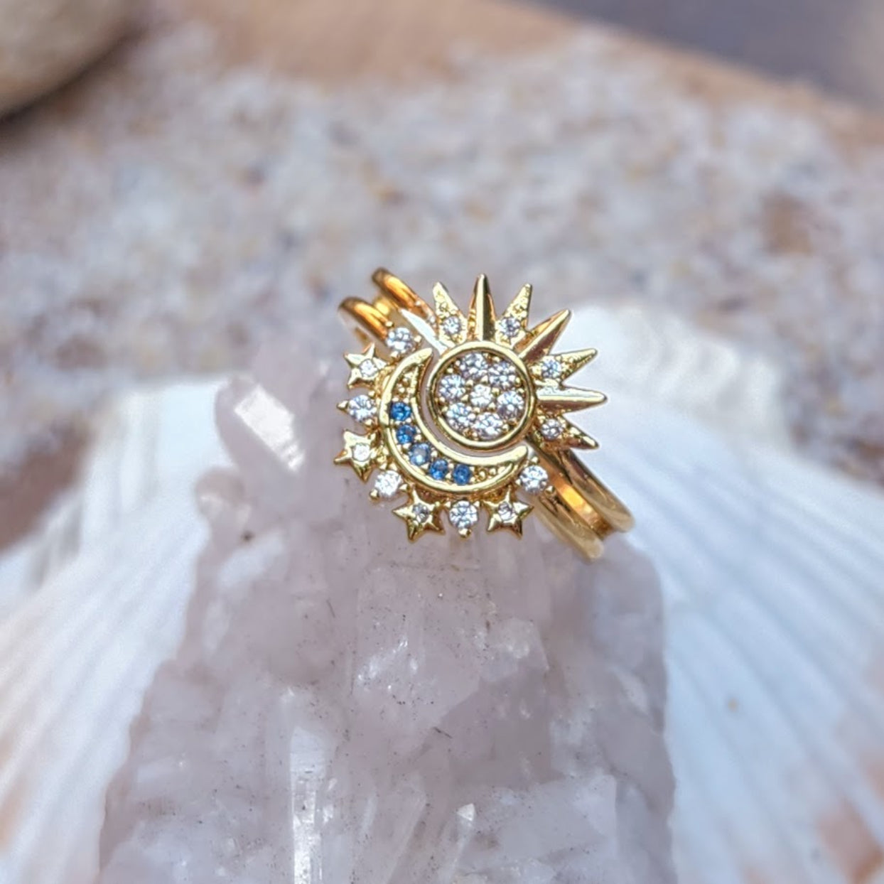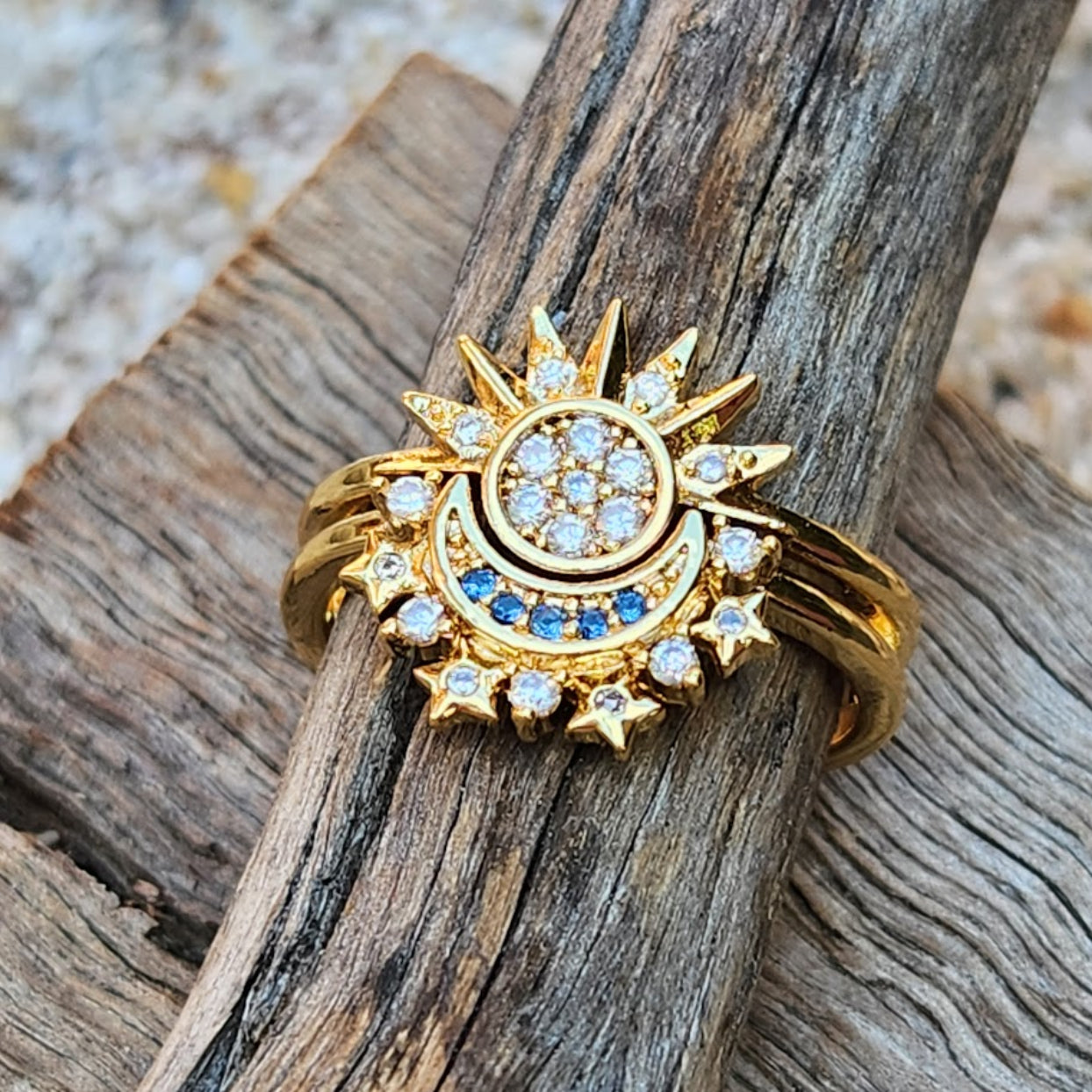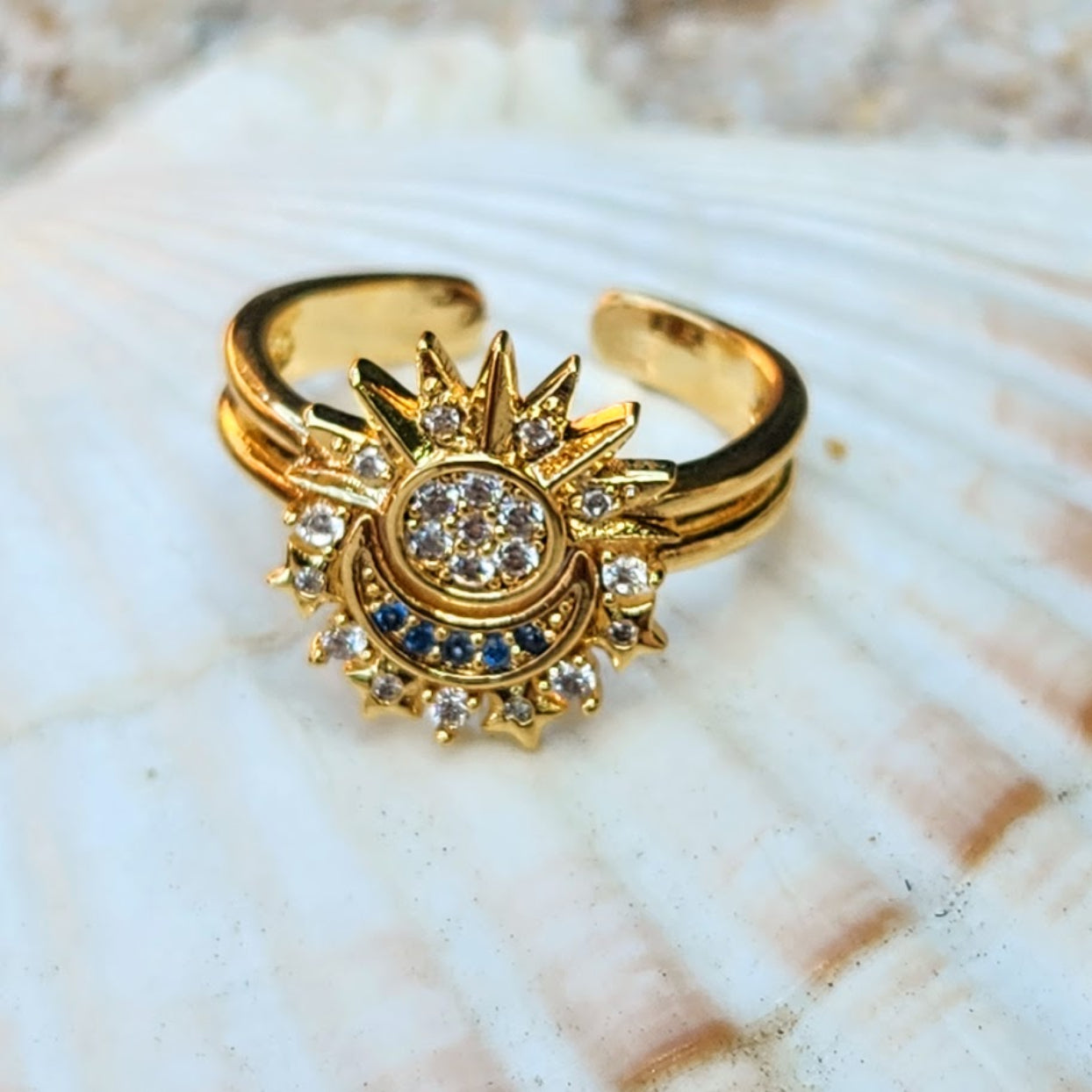 ABOVE ALL - ADJUSTABLE WATERPROOF DOUBLE SUN MOON & STARS 18K GOLD RING