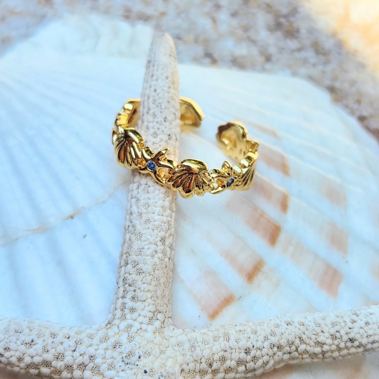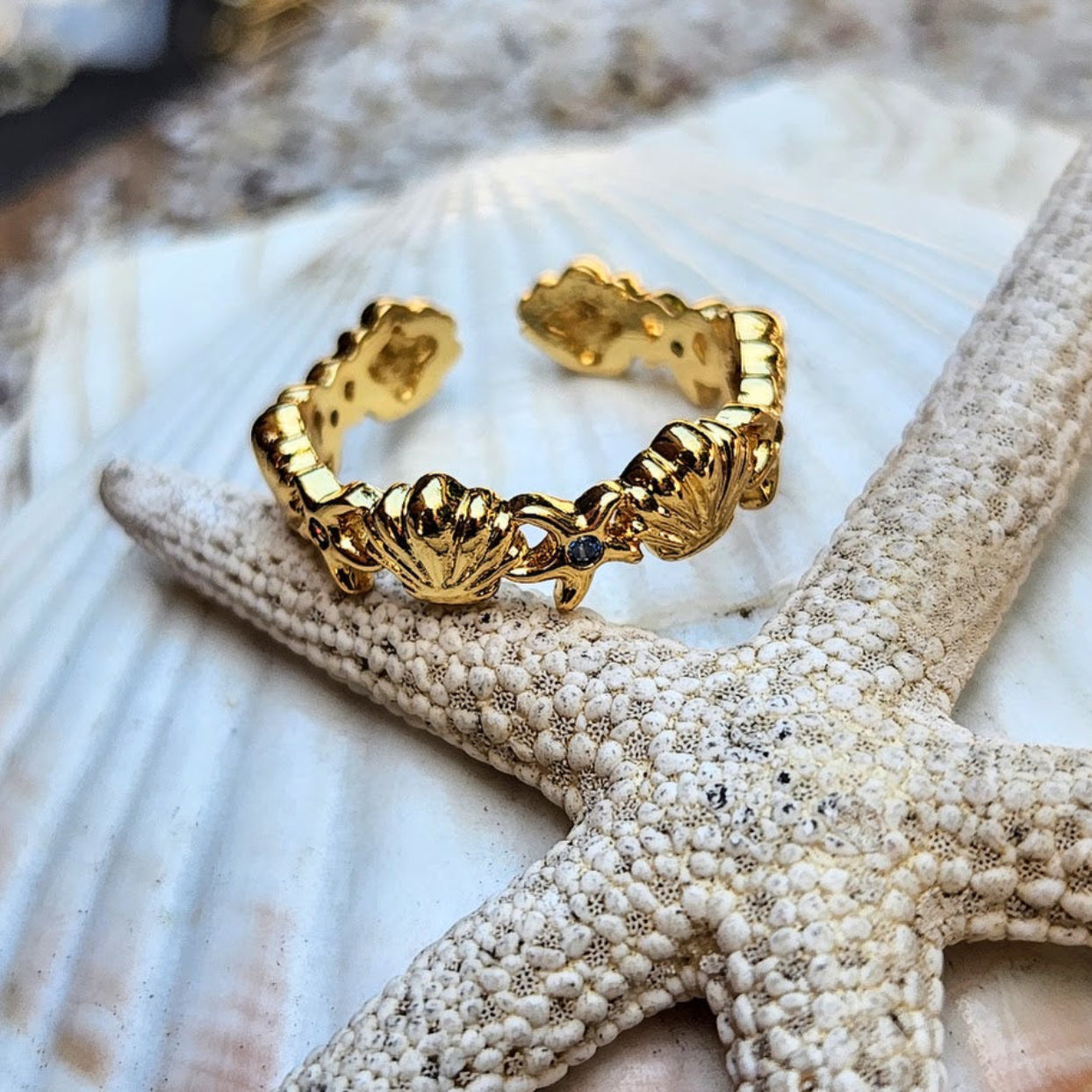 STARS & SHELLS - ADJUSTABLE WATERPROOF STARFISH & SHELL 18K GOLD RING