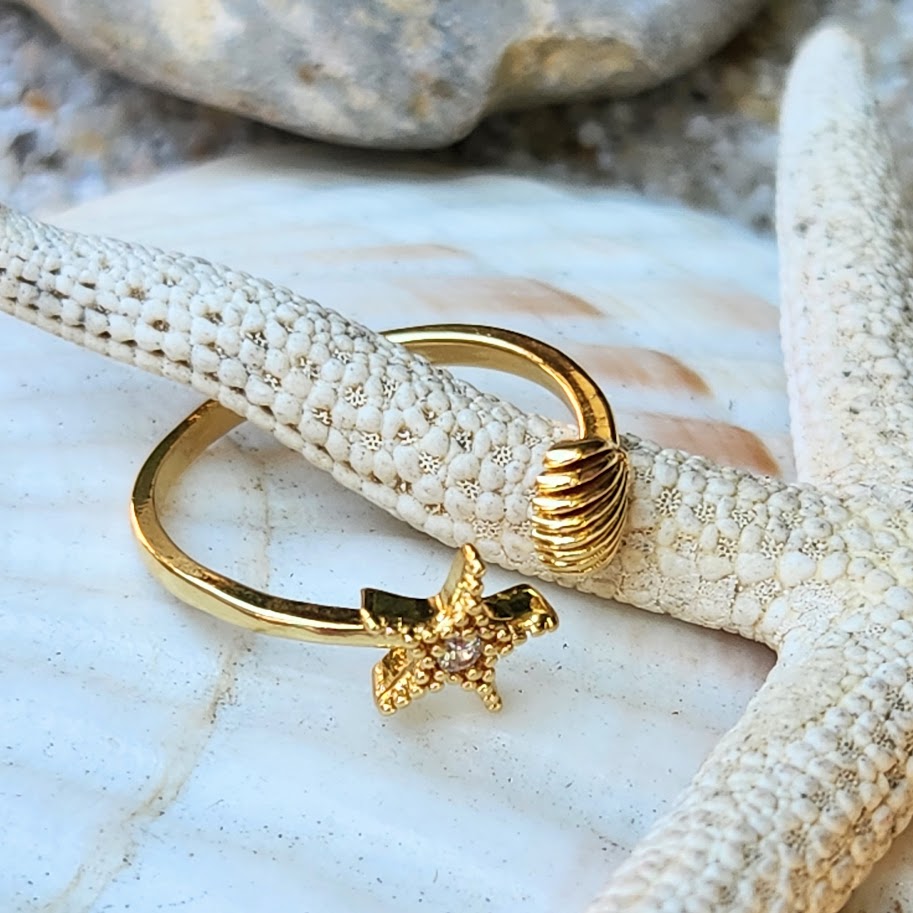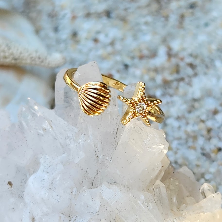 Delicate 18k Gold plated Adjustable Shell & Star Ring with tiny cubic zirconia's...easily adjustable