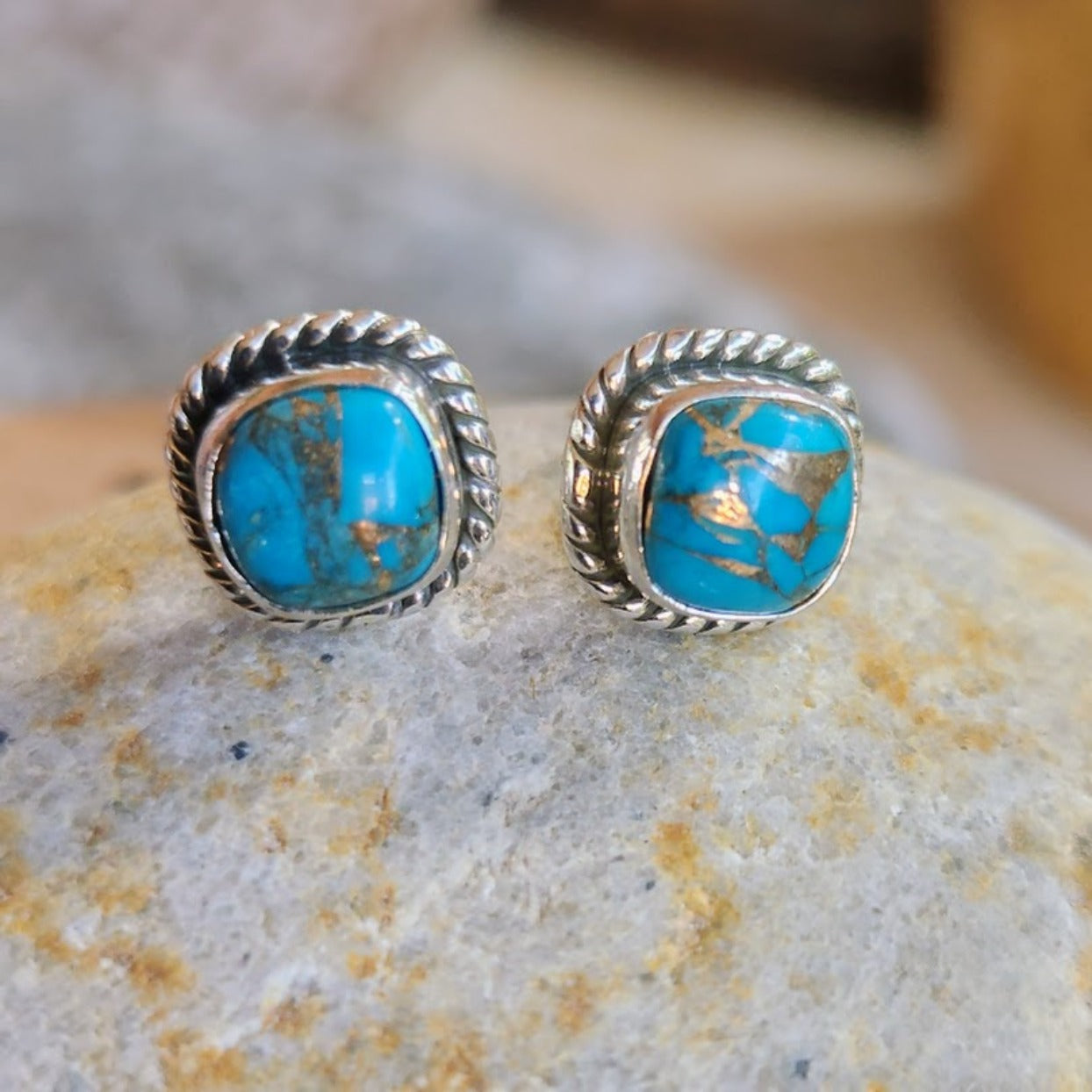 Petite Copper Boho Turquoise Stud 925 Sterling Silver Earrings