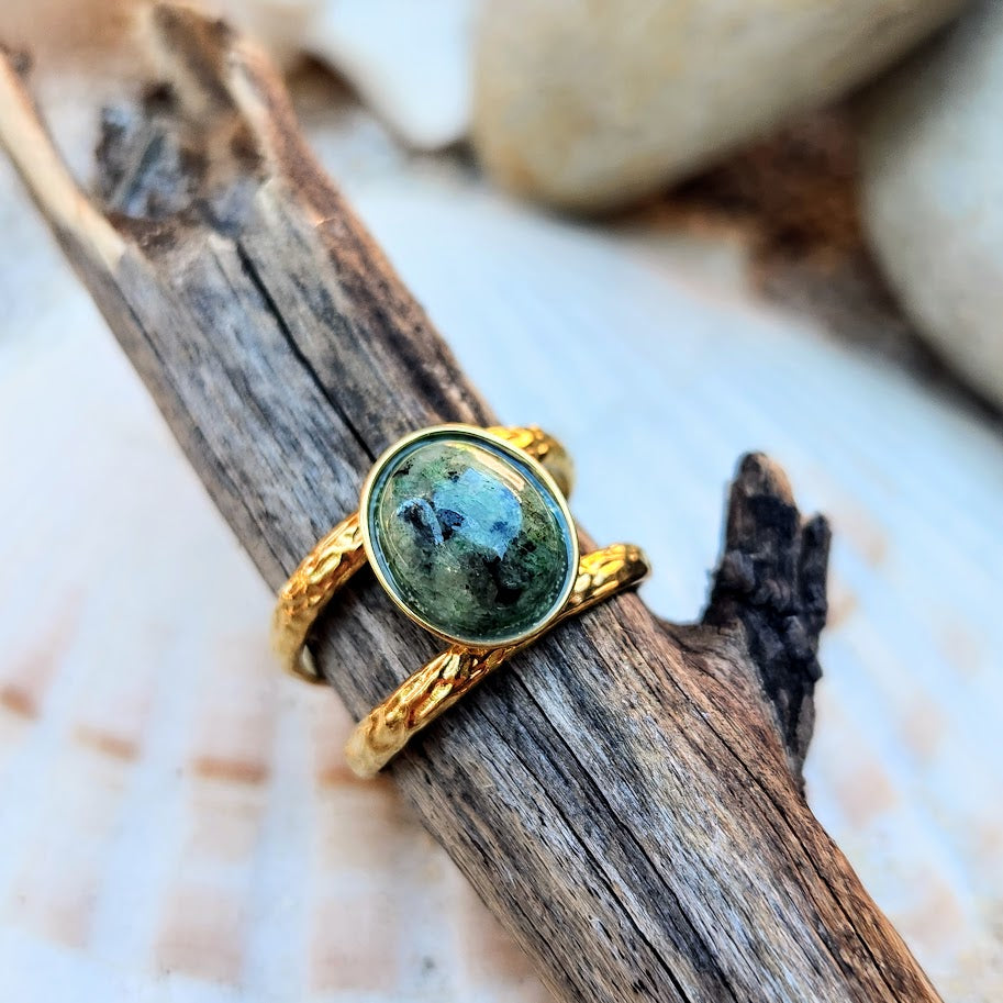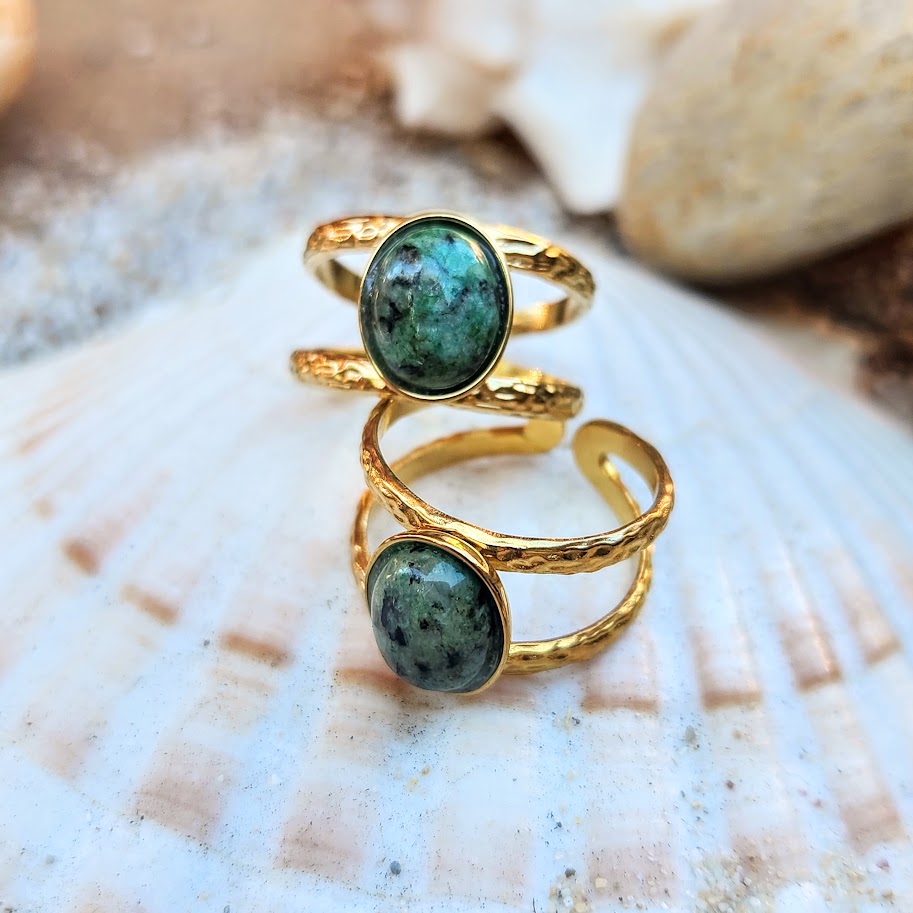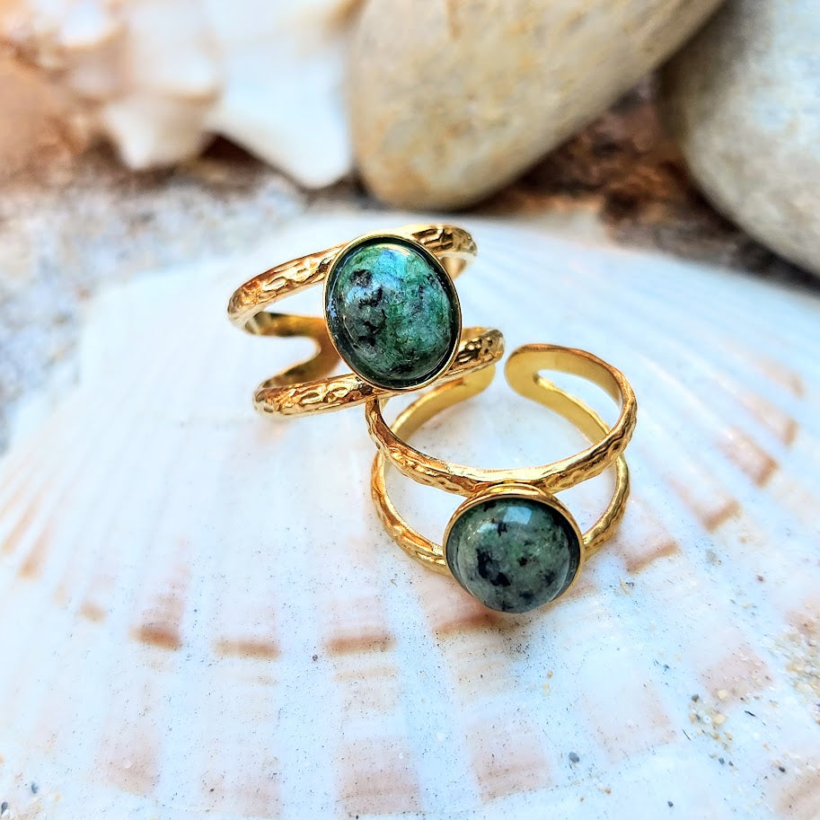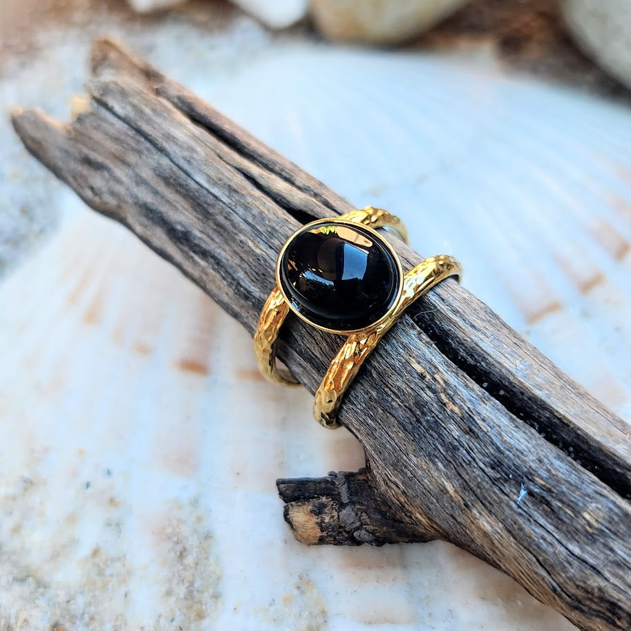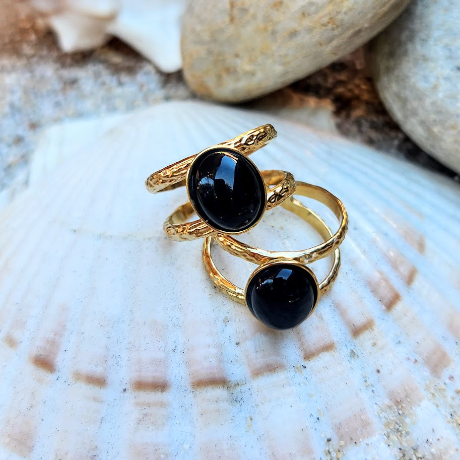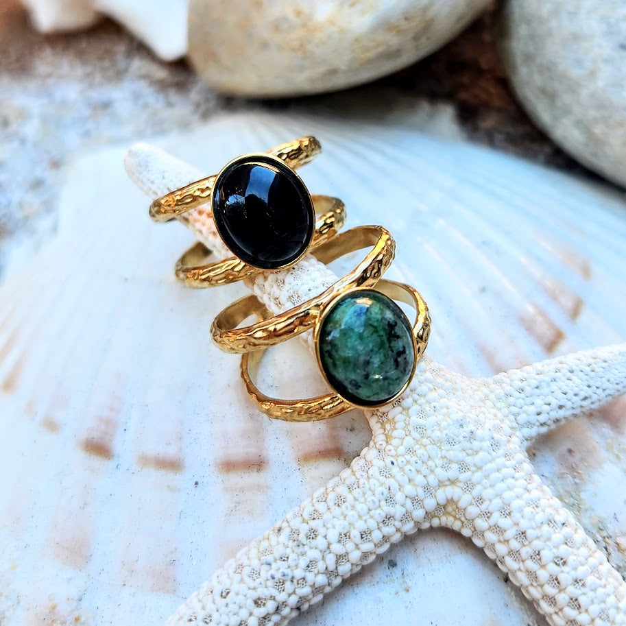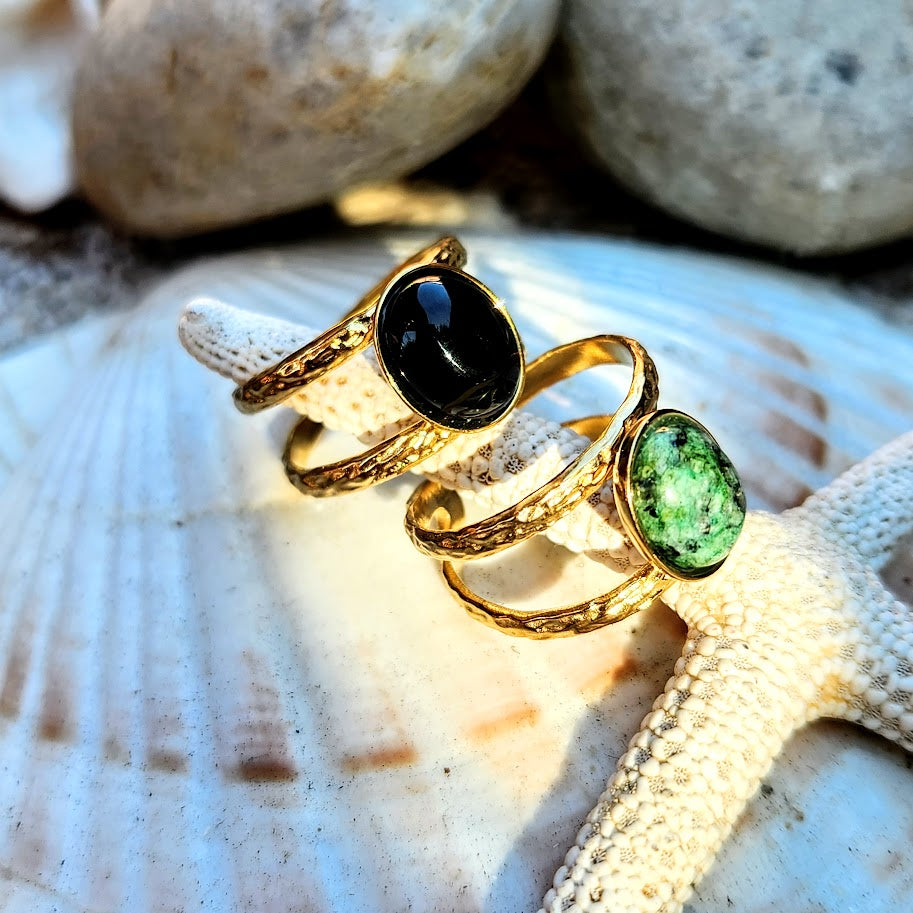 Adjustable Double Hammered Gold Natural Turquoise or Onyx Stone Rings