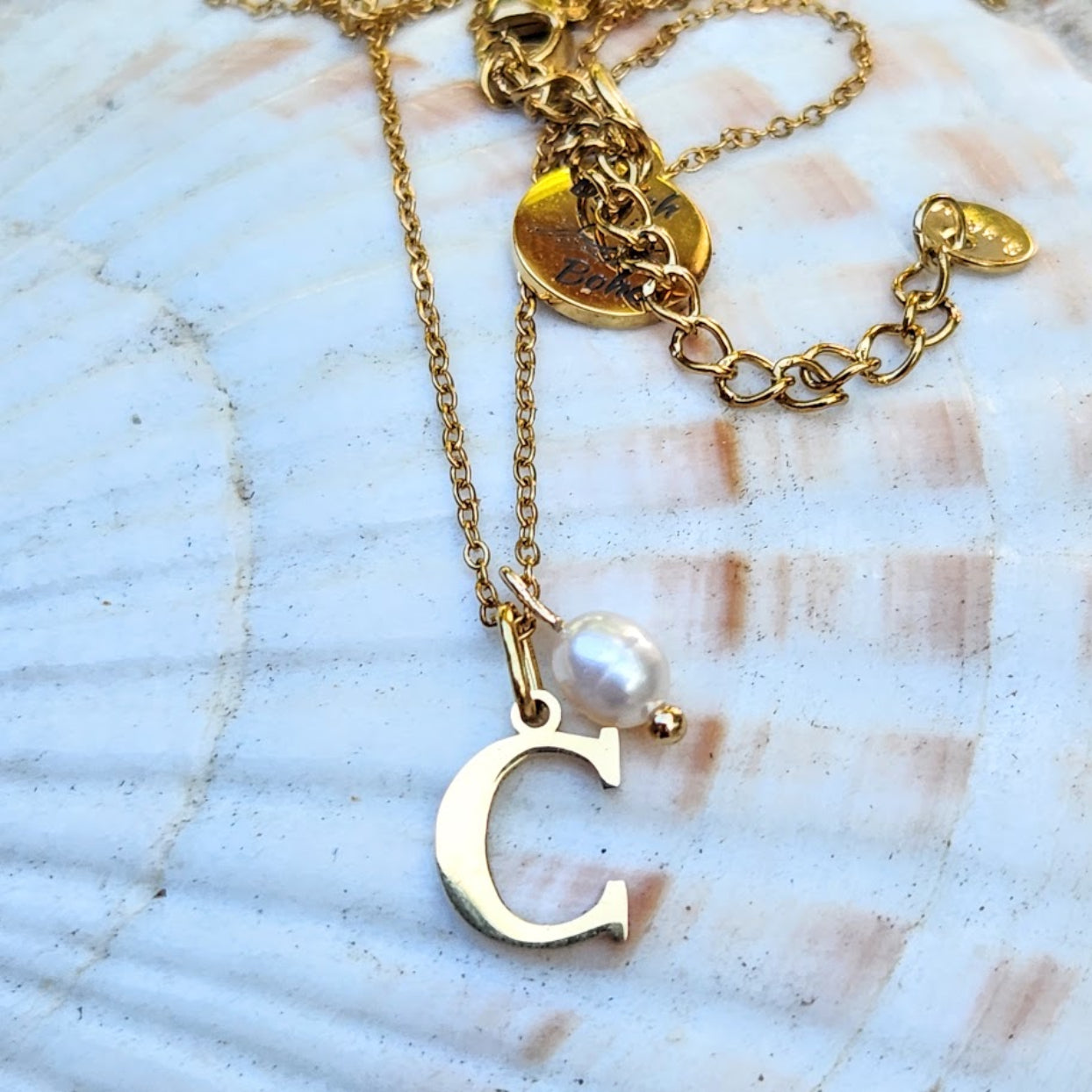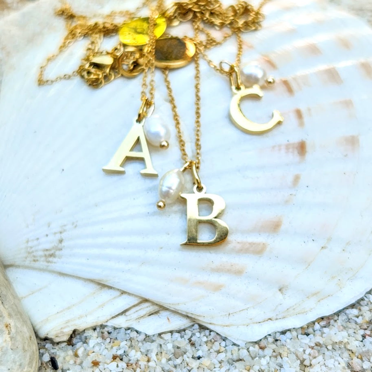 Your Single Initial - Initial Pendant with Small Baroque Natural Pearl 18k Gold Waterproof & Tarnish Resistant Necklace (pearl sizes may vary slightly as they are made with all Natural Baroque Pearls)