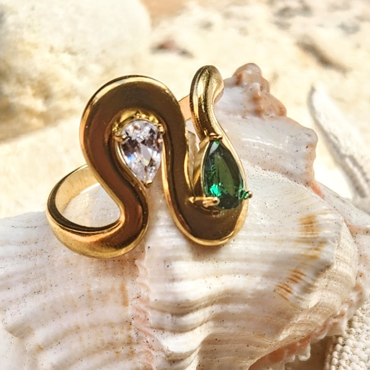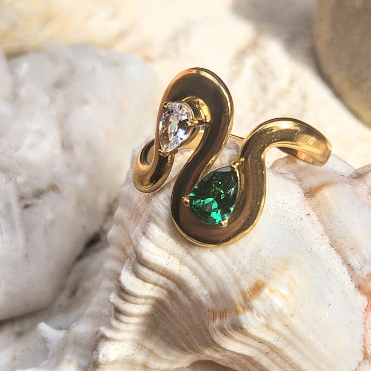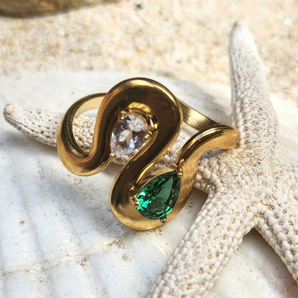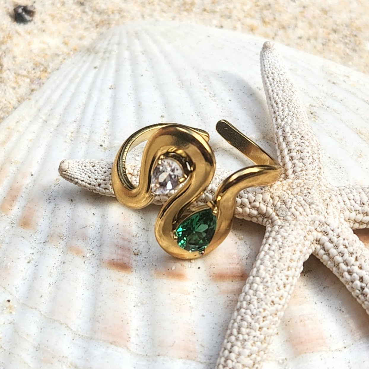 Adjustable Open Band Emerald & Cubic Zirconia 18k Gold Water resistant Ring