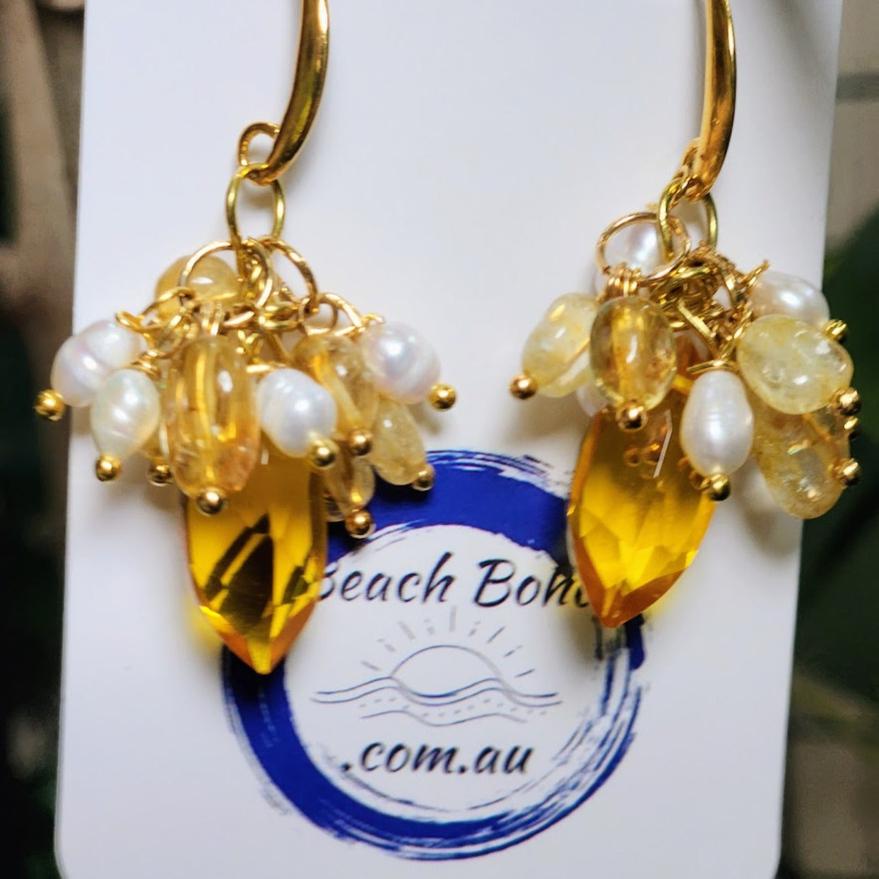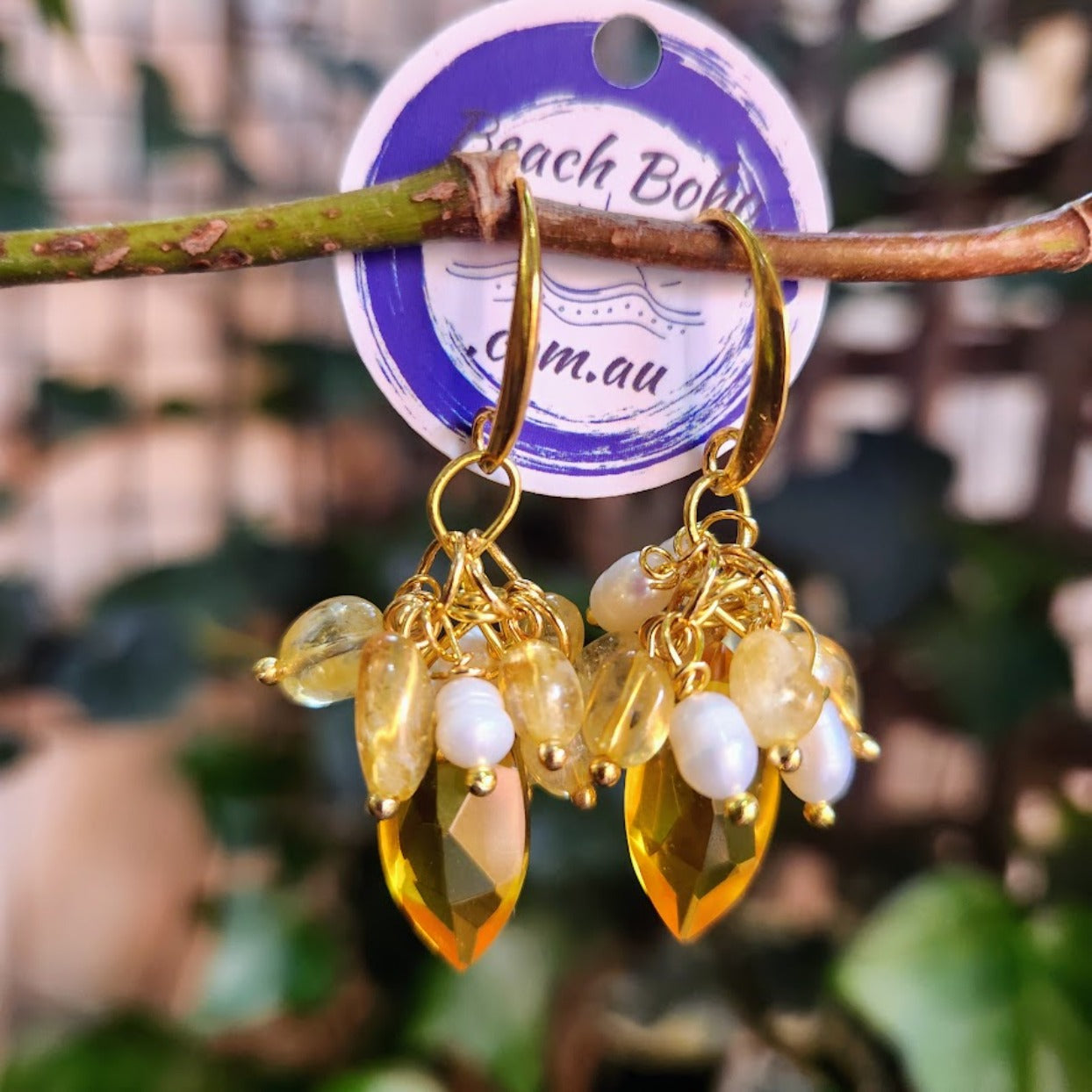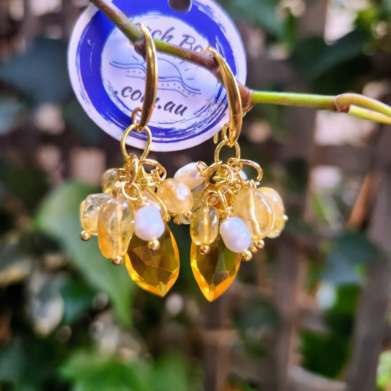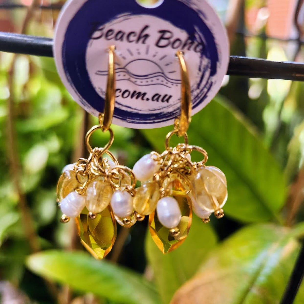 SUN & SEA - CITRINE POLISHED STONE & BABY BAROQUE PEARL HOOK EARRINGS