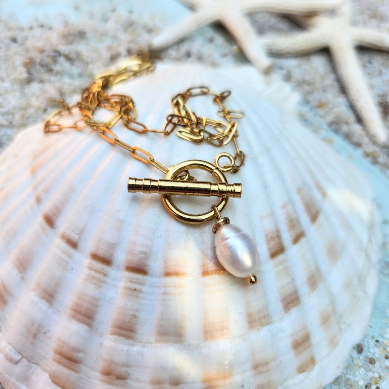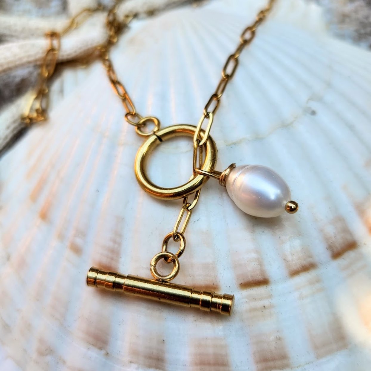 PEARL T CLASP WATERPROOF PAPERCLIP 18K GOLD NECKLACE