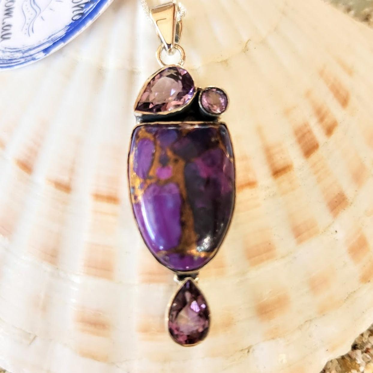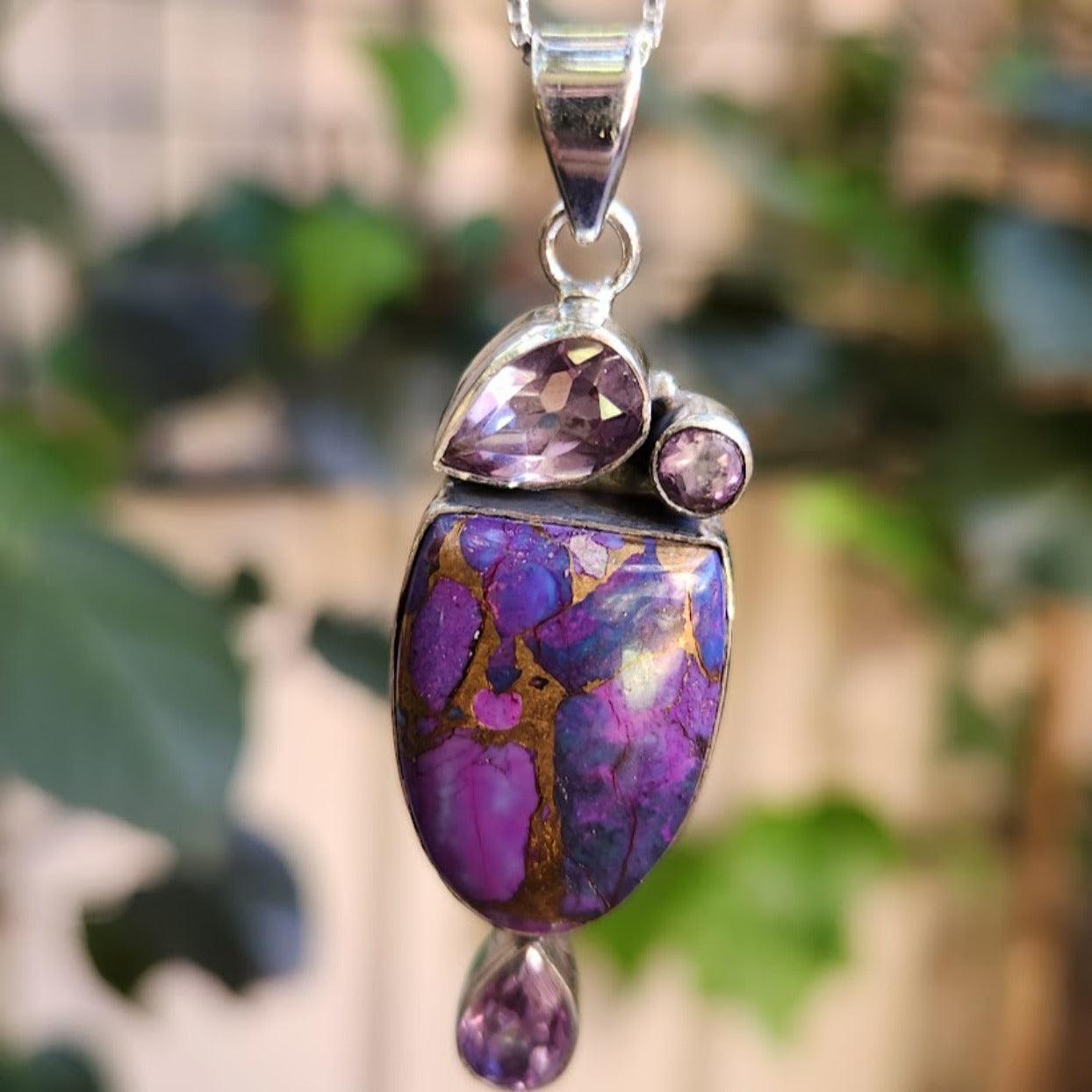 Purple Copper Turquoise and Three Amethyst crystals Pendant / 925 Sterling Silver Chain included with Silver Polishing Cloth