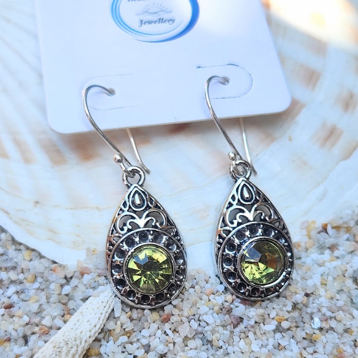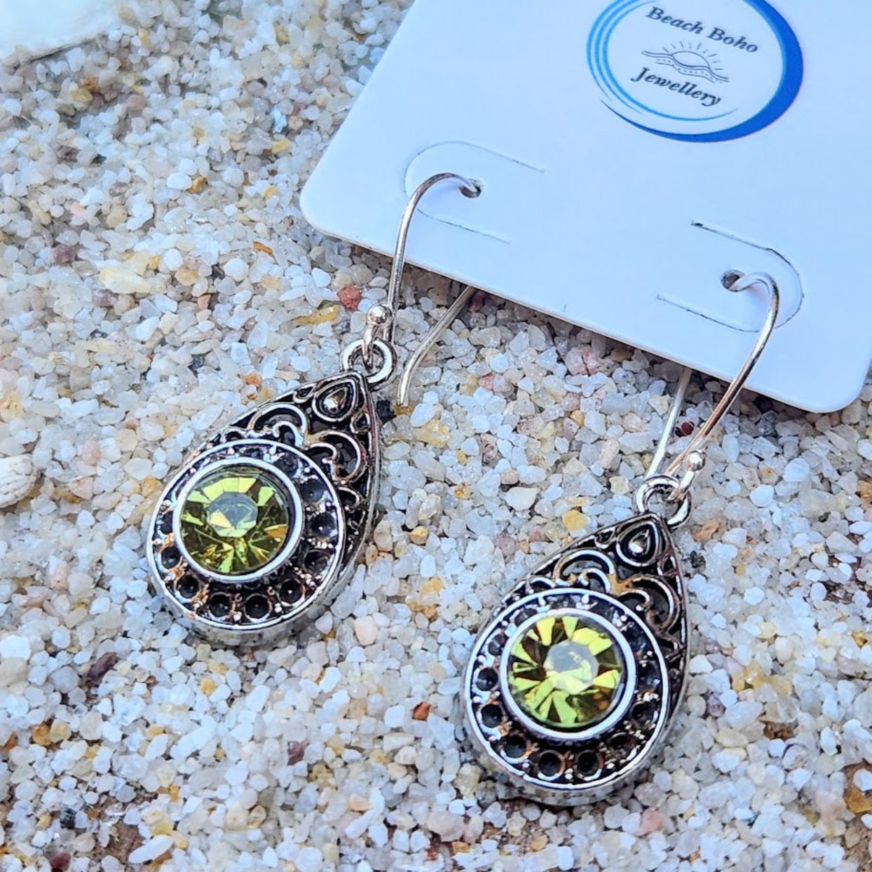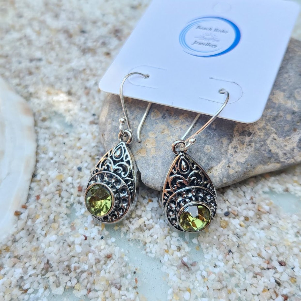 Vintage Styled - Peridot Crystals Oxidised Silver Plated Drop Earrings Teardrop Shaped Hilltribe Pure Silver Handcrafted Hook Dangle Earrings